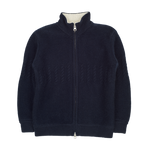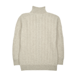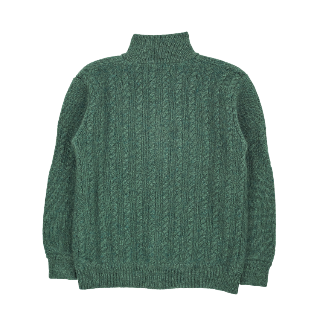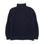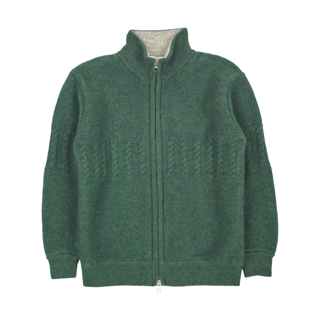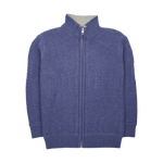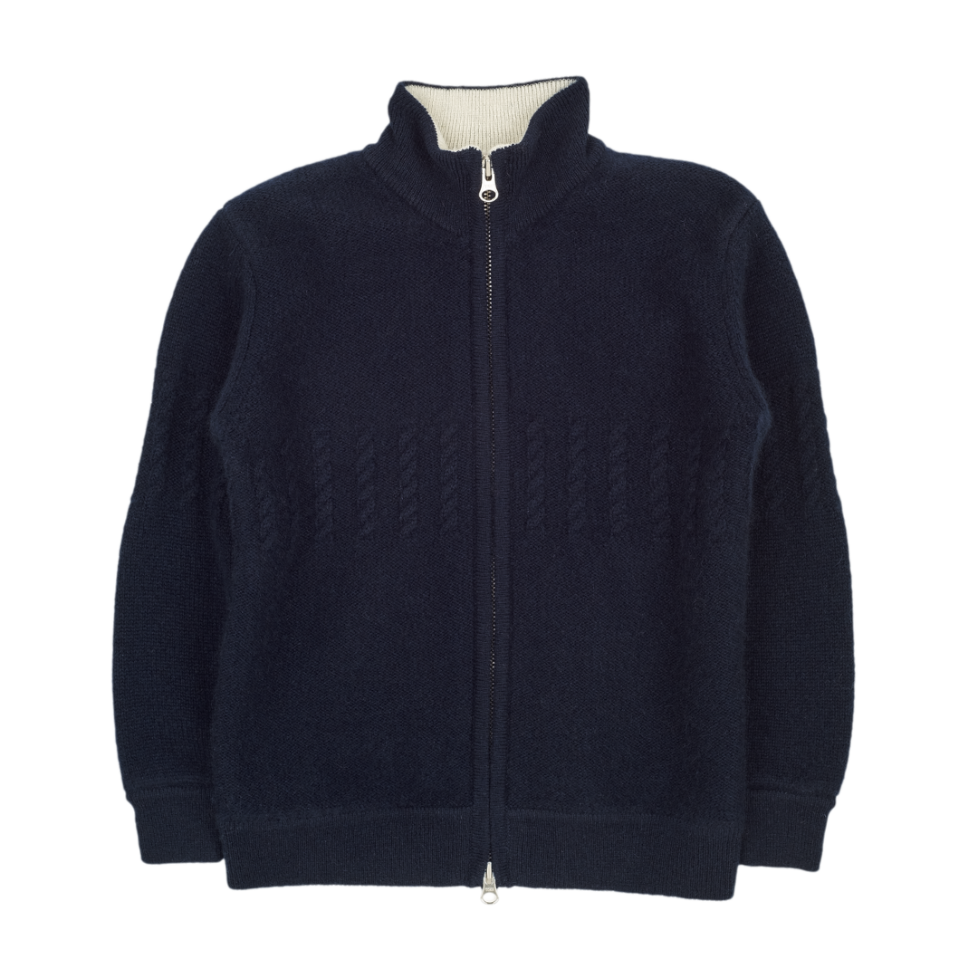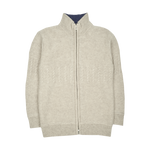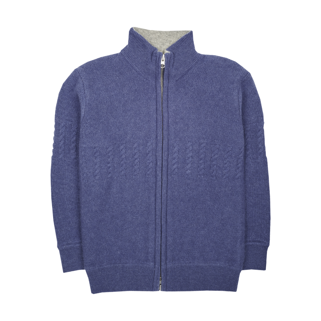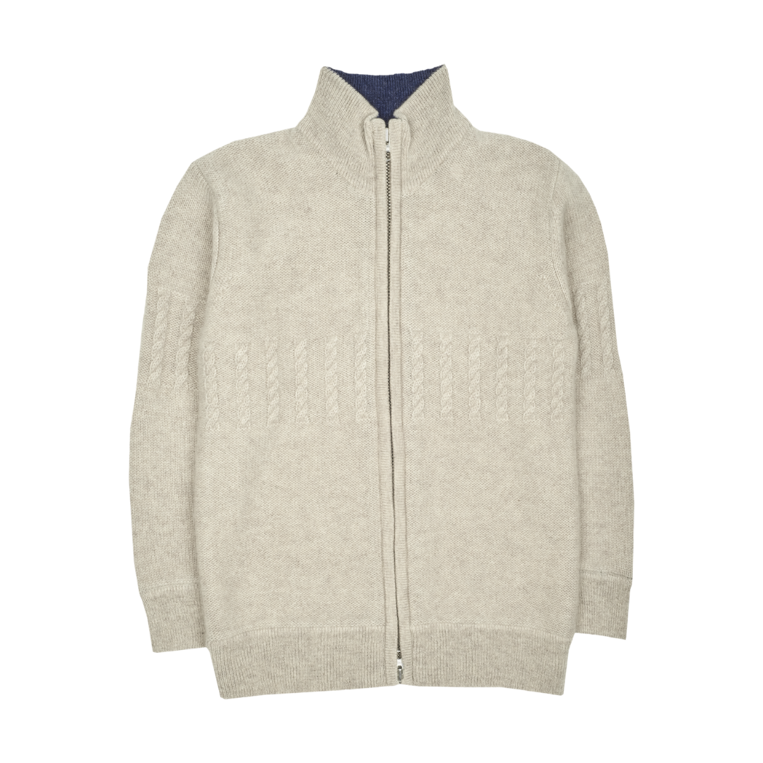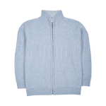 A classic 100% cashmere high neck boy cardigan with cable knit panels, long sleeves, a ribbed hem, and zip fastening. Ideal for all occasions.