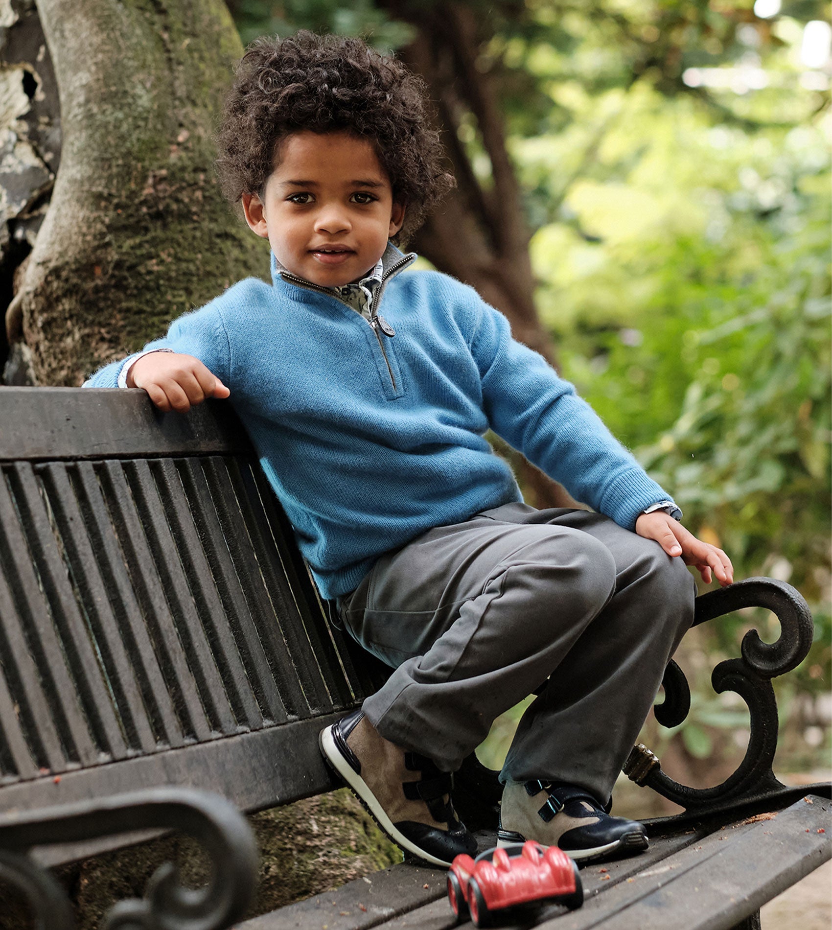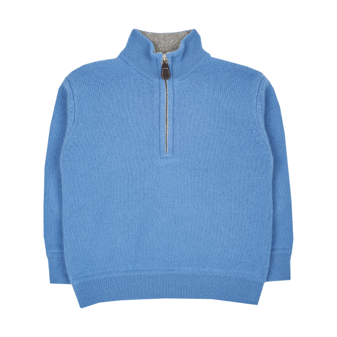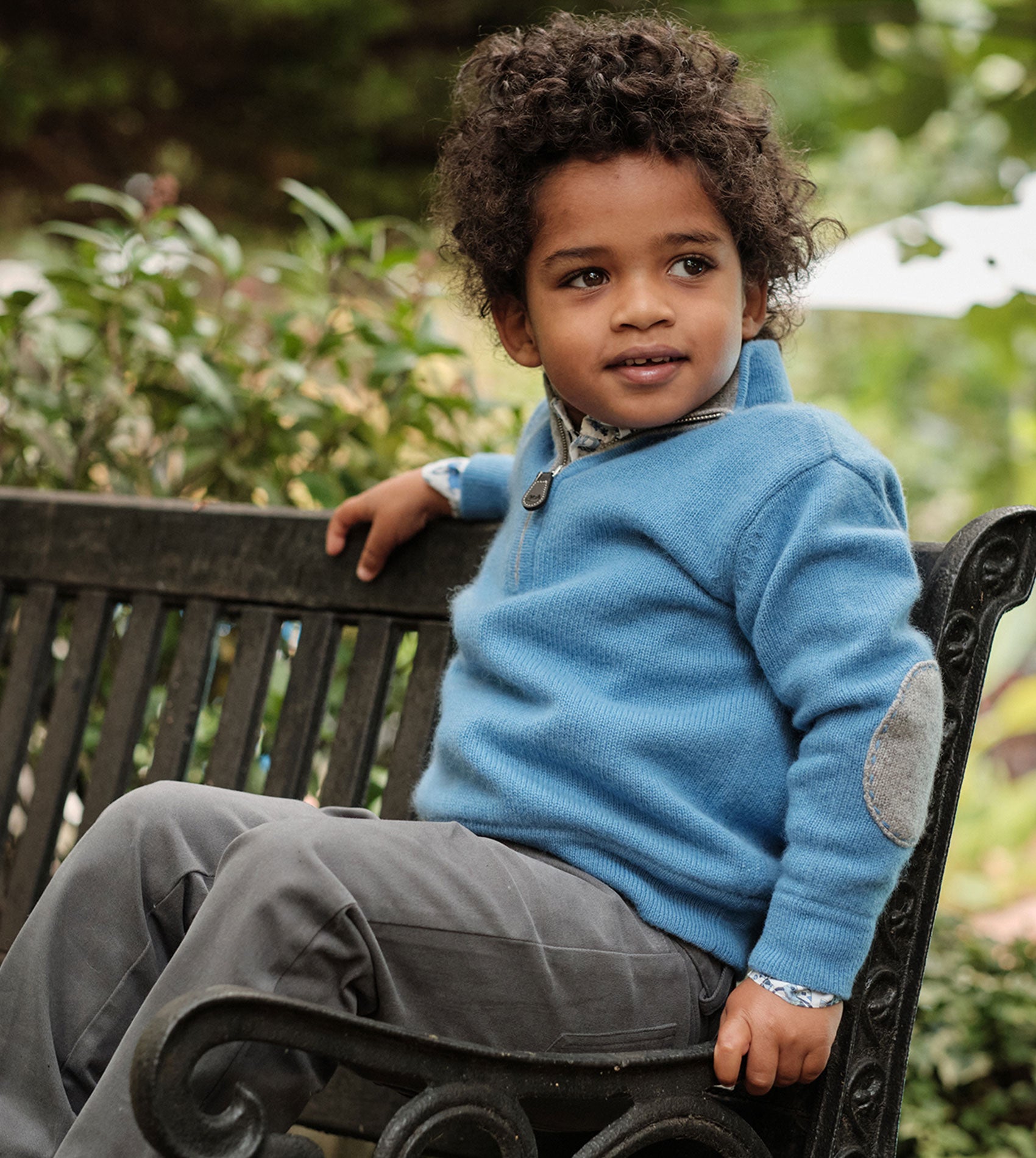 Our super-soft 100% Mongolian cashmere boy jumper with the practical addition of a zip. Contrast colour patches at the elbows and trim inside the collar, cuffs, zip and waist all add to its understated style.