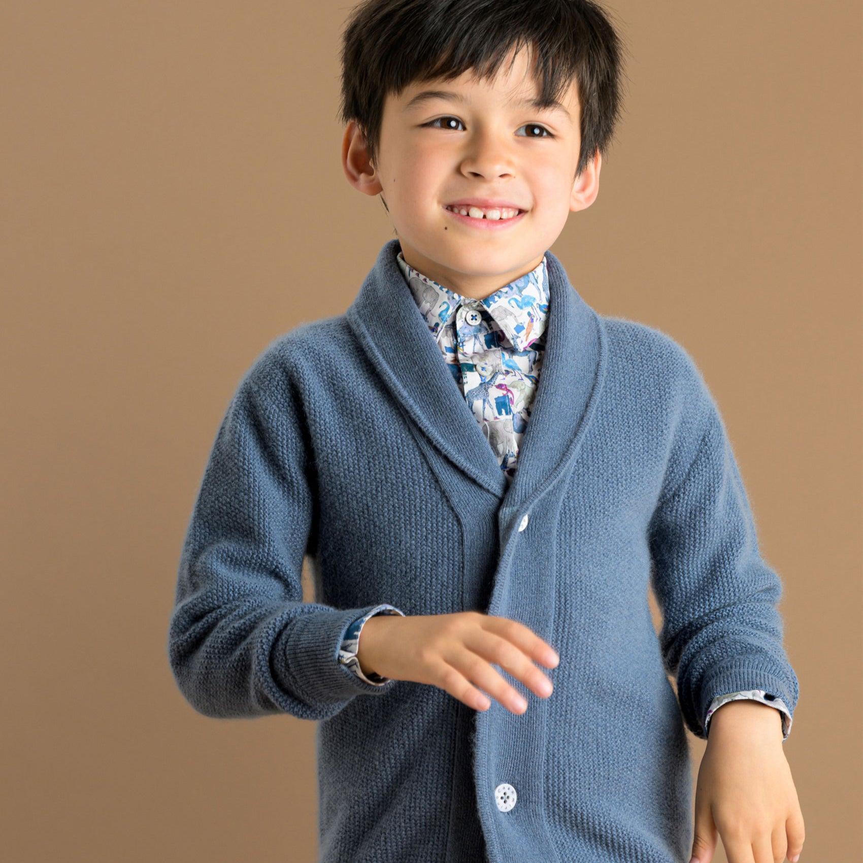 Smarten up with this 100% Cashmere boy blazer. Featuring a V-neck collar, long sleeves, and Cashmirino signature buttons. In spring and autumn, this blazer can be worn instead of a jacket directly on top of a shirt, making your little boy look very cute and elegant.