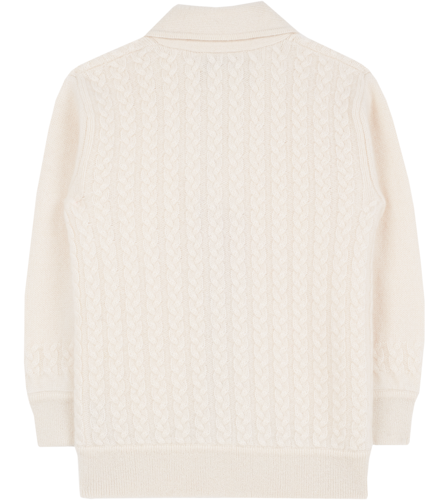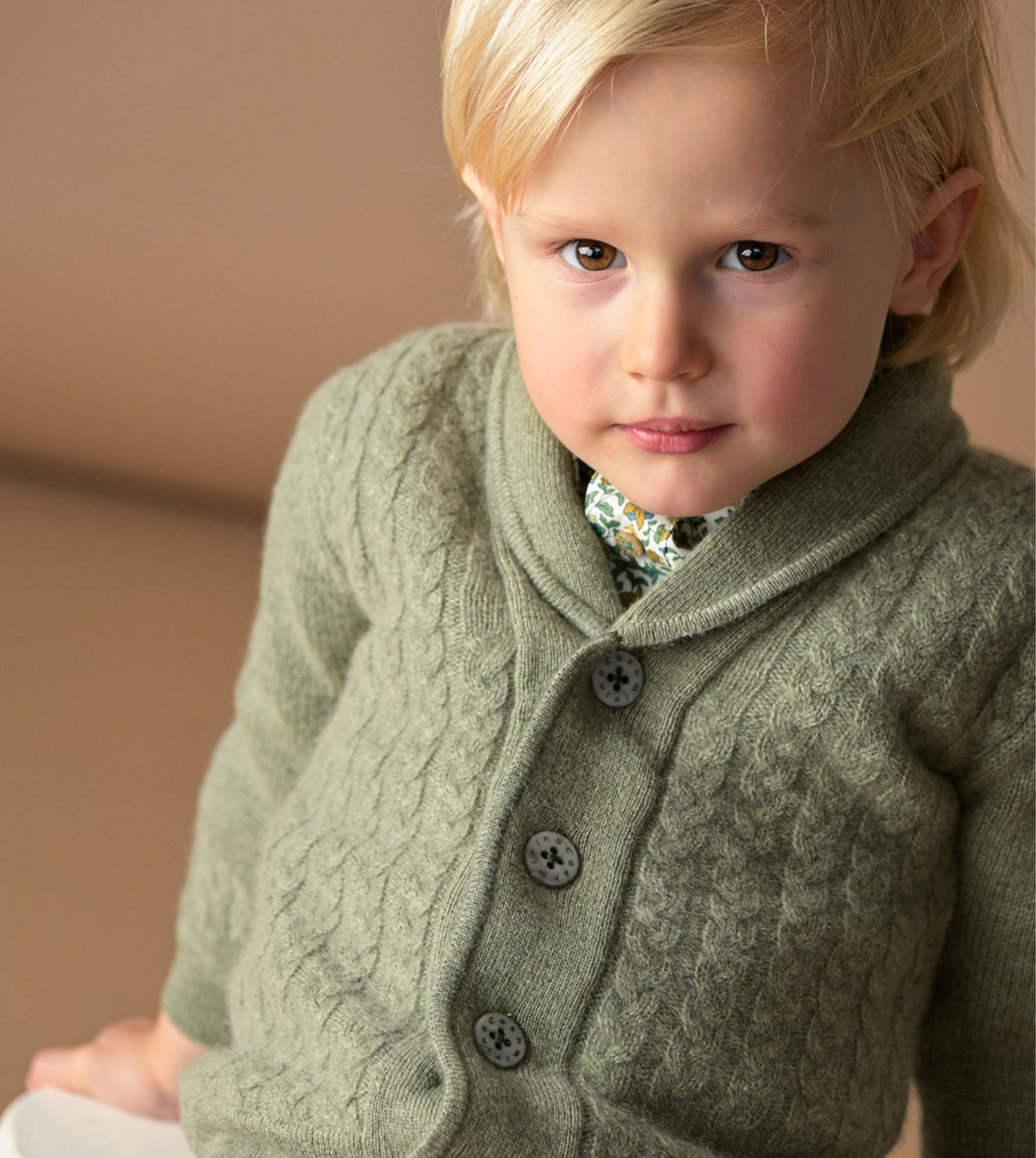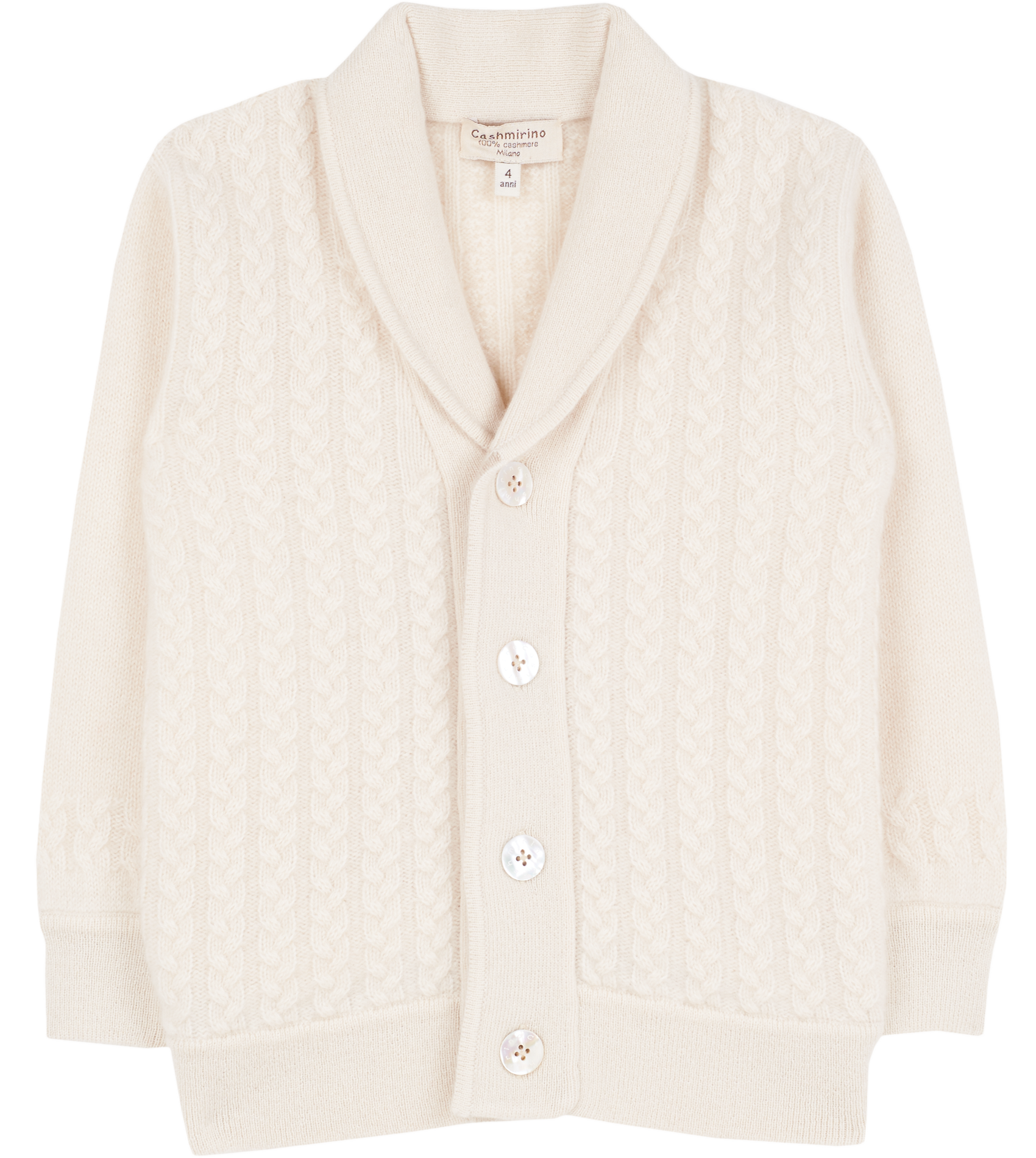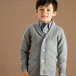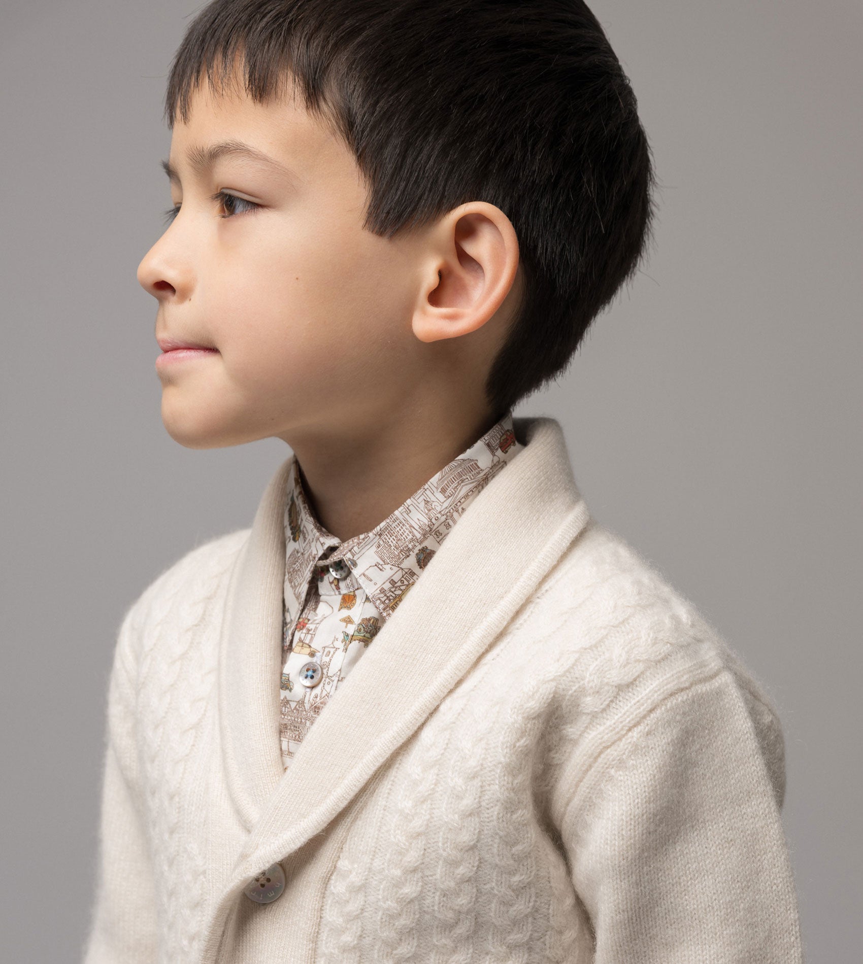 Knitted in soft 100% Cashmere, incorporate a formal look into your little boy's wardrobe. Our long-sleeved blazer is ideal for everyday layering. This features a cable knit and a shawl collar so that your little one can dress to impress. This classic piece is best for the colder months and can be paired with one of our shirts. With ribbed hems, a contrasting colour on the inside of all borders, and the addition of our Cashmirino buttons, this is a delightful piece for your little one.