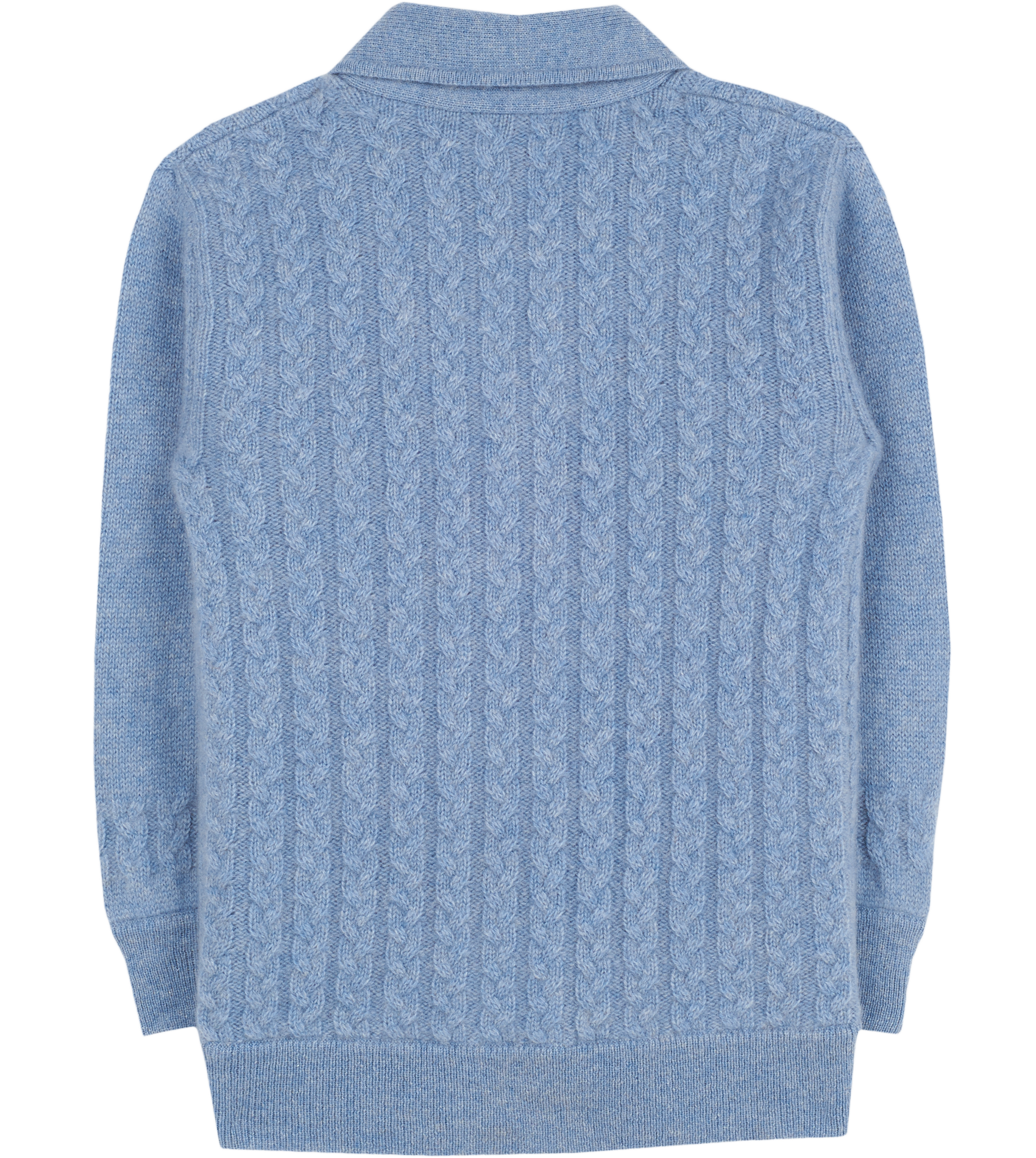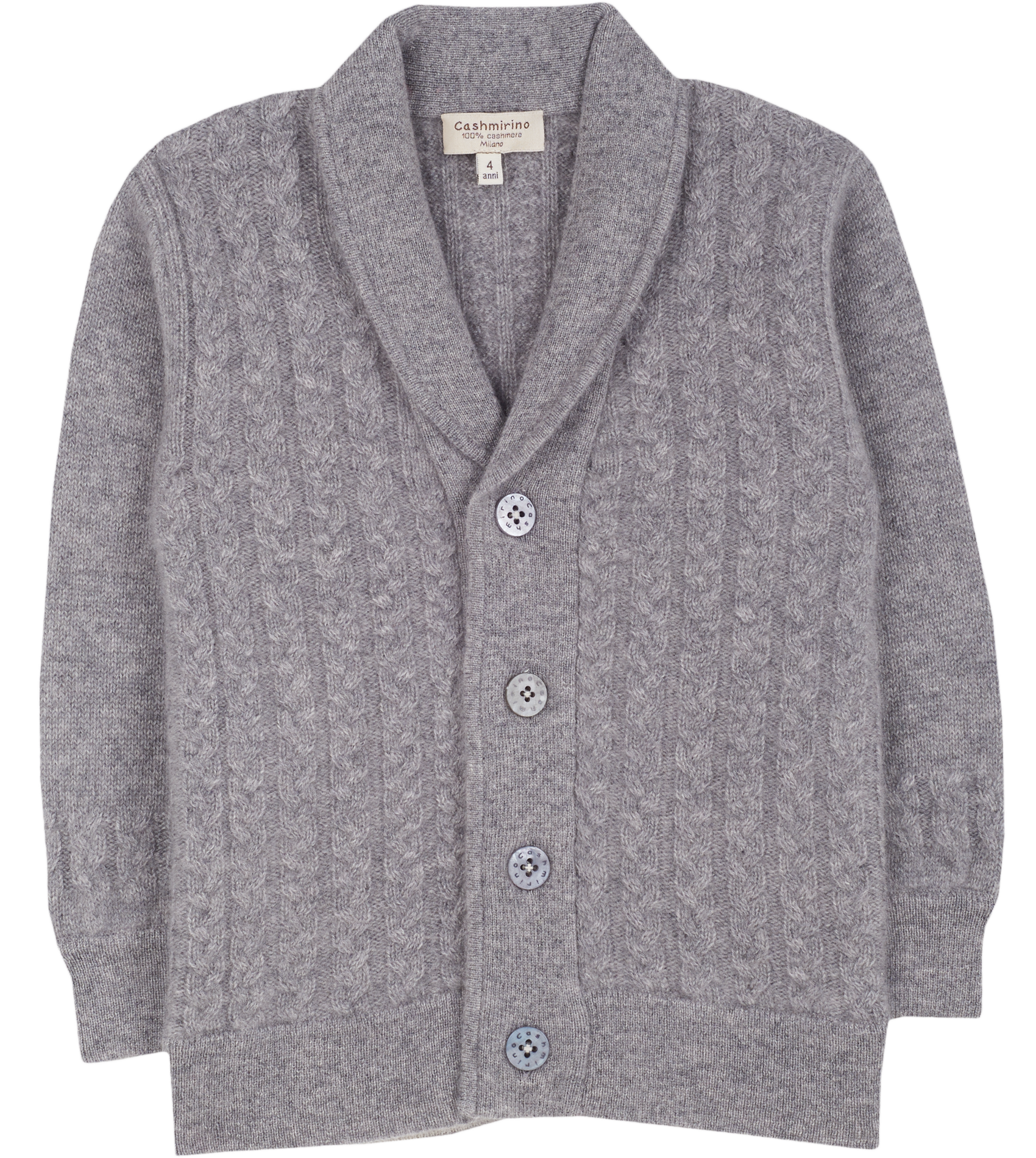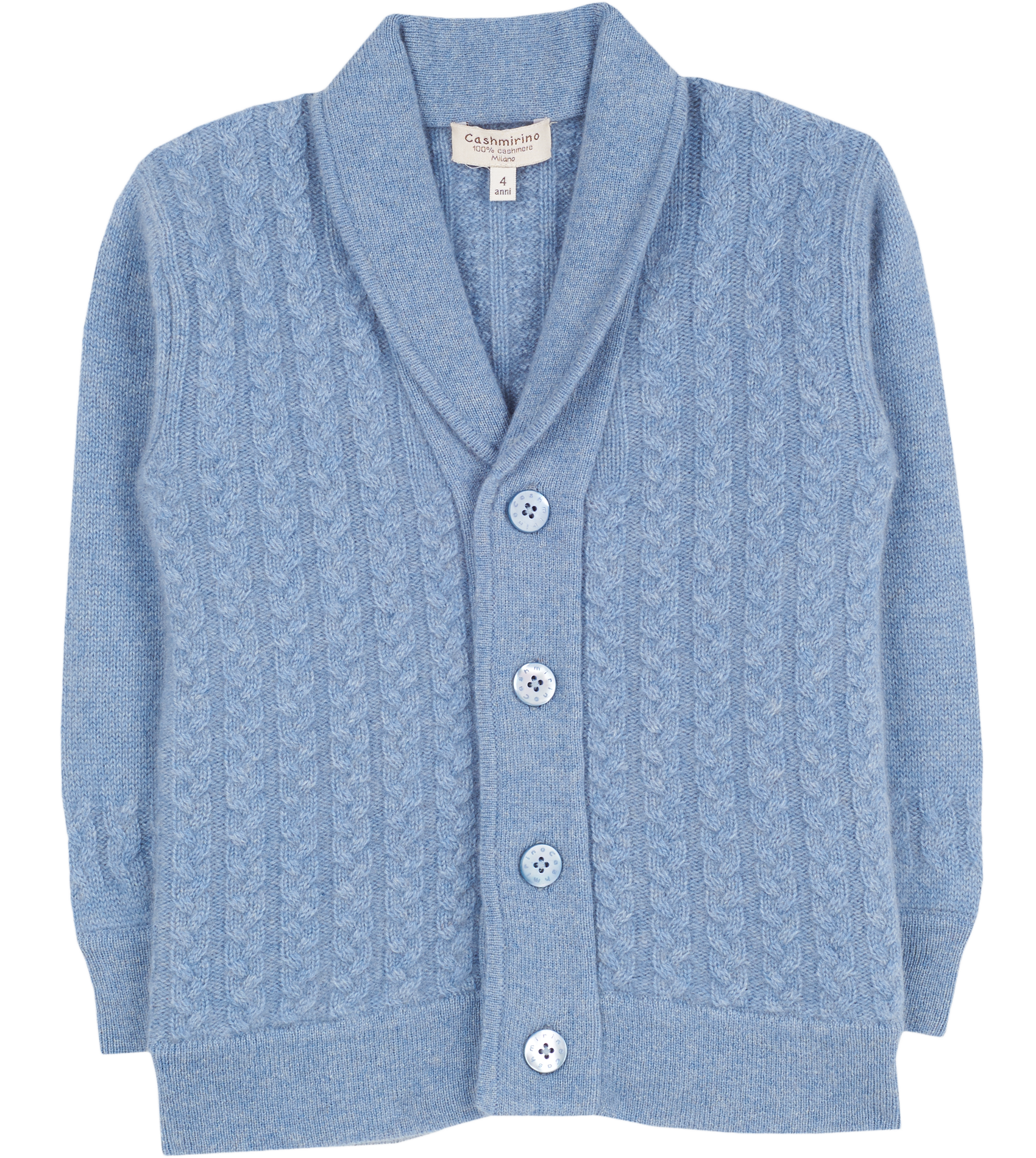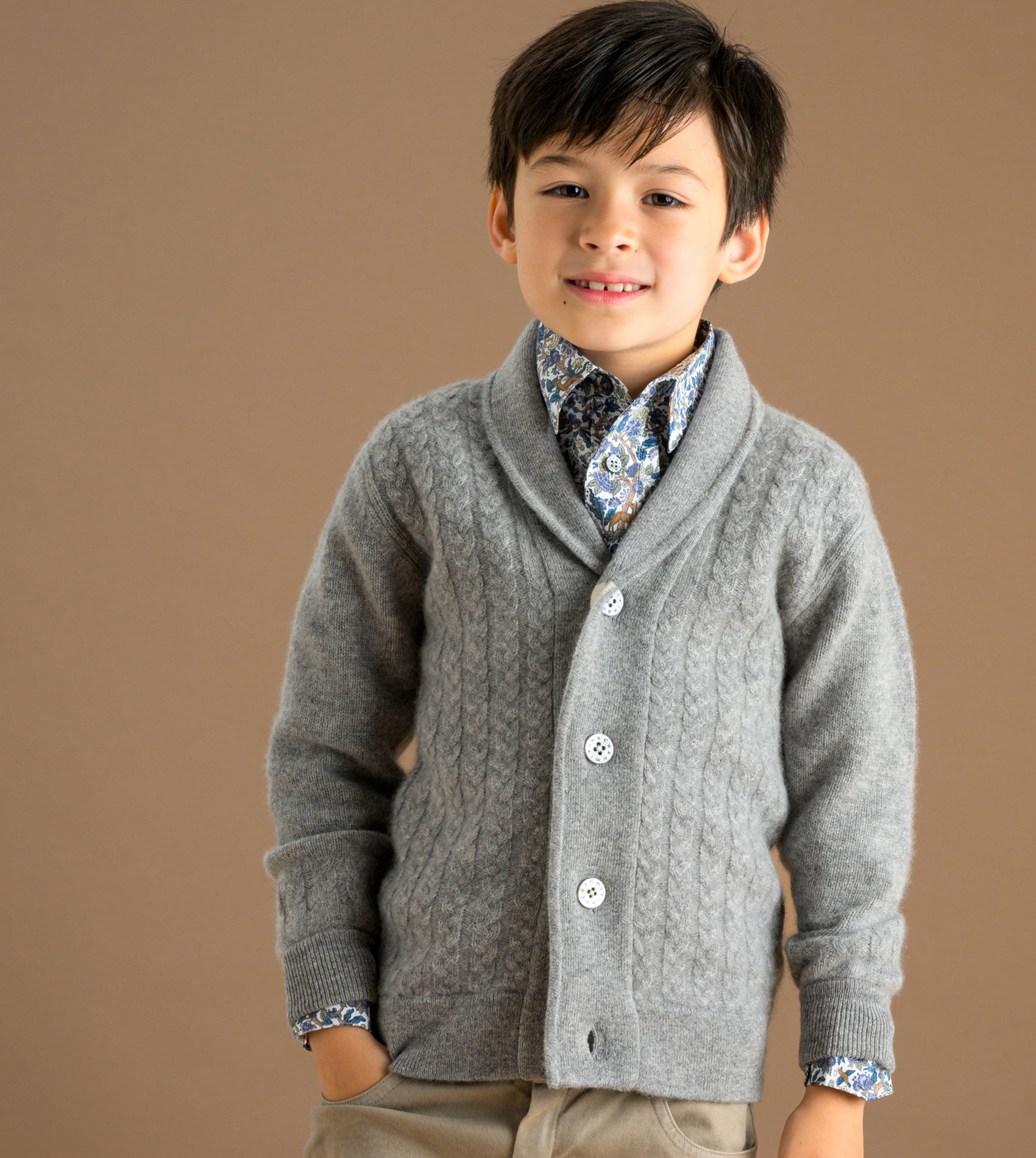 Knitted in soft 100% Cashmere, incorporate a formal look into your little boy's wardrobe. Our long-sleeved blazer is ideal for everyday layering. This features a cable knit and a shawl collar so that your little one can dress to impress. This classic piece is best for the colder months and can be paired with one of our shirts. With ribbed hems, a contrasting colour on the inside of all borders, and the addition of our Cashmirino buttons, this is a delightful piece for your little one.