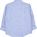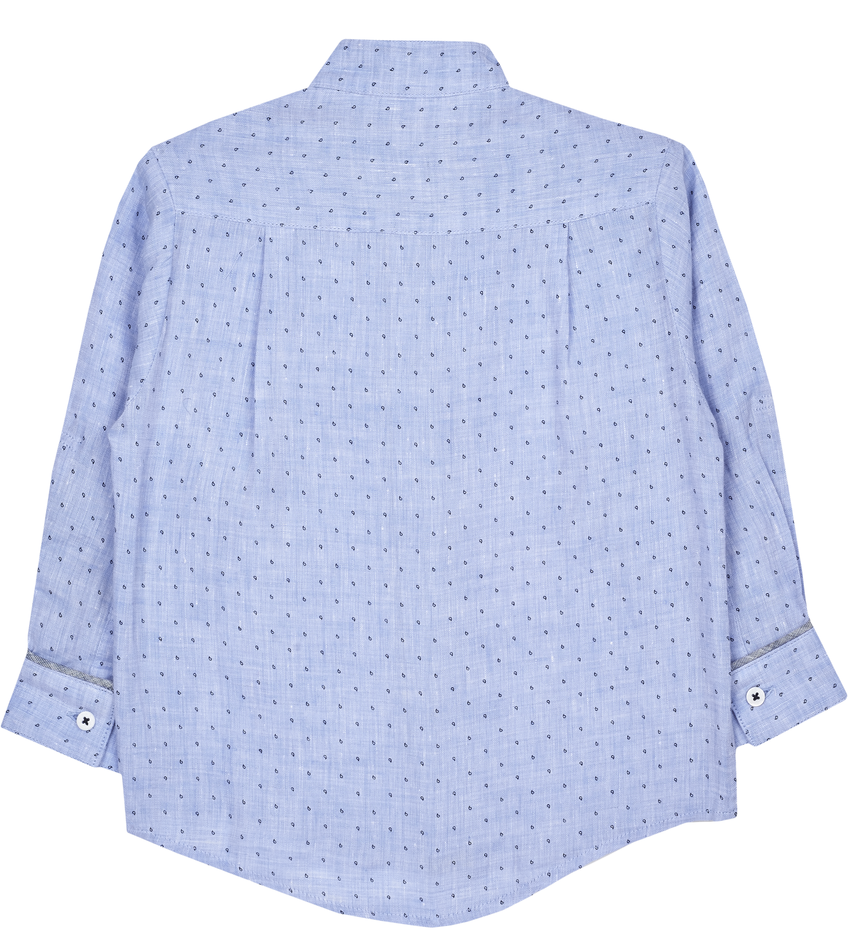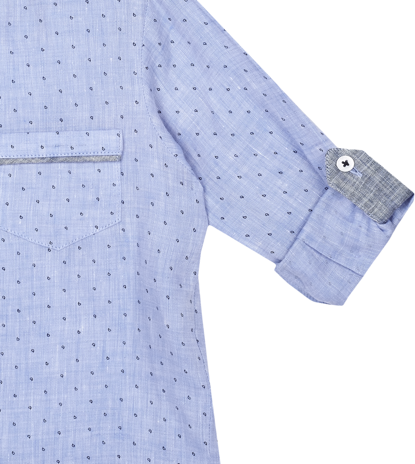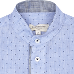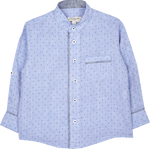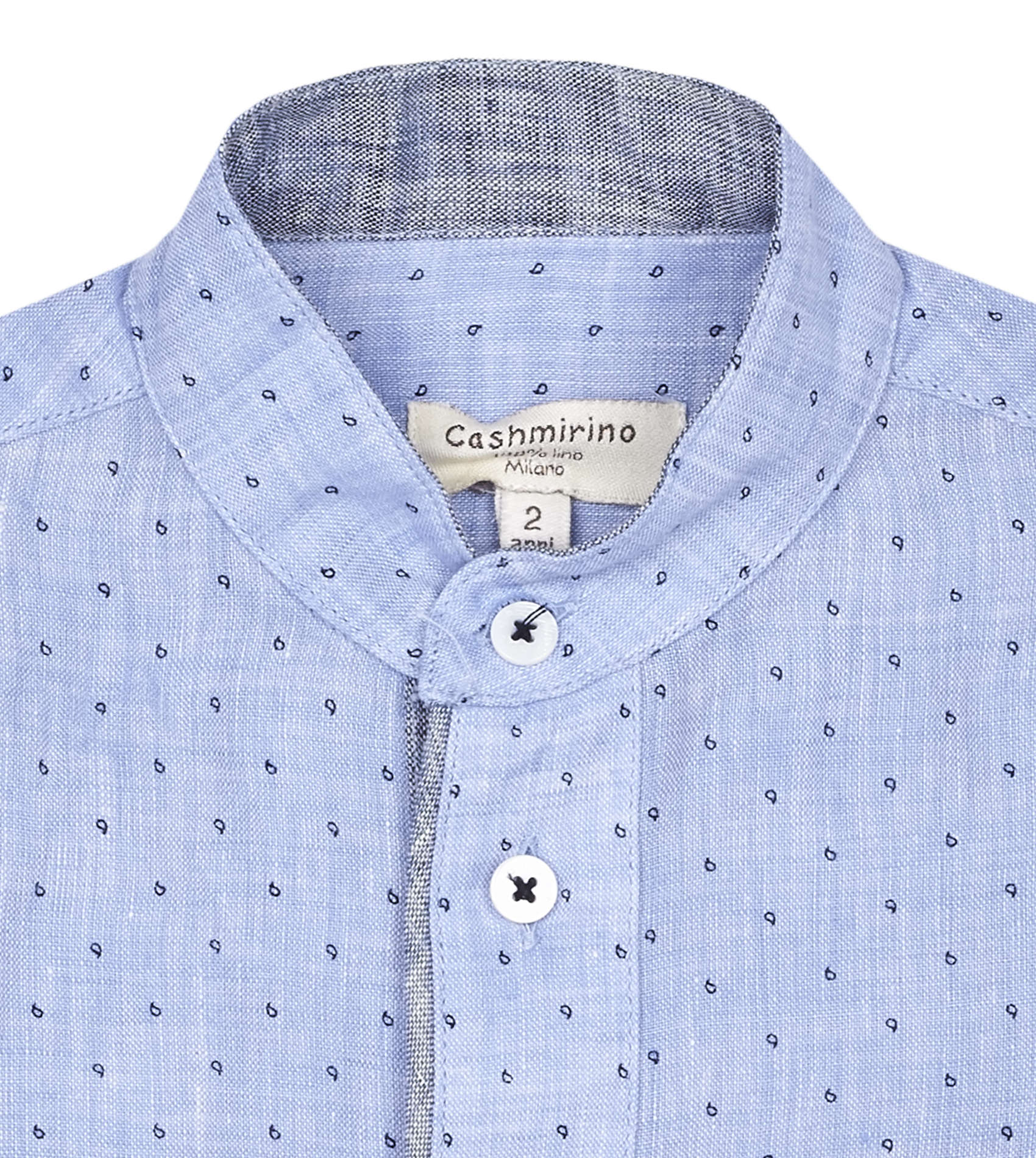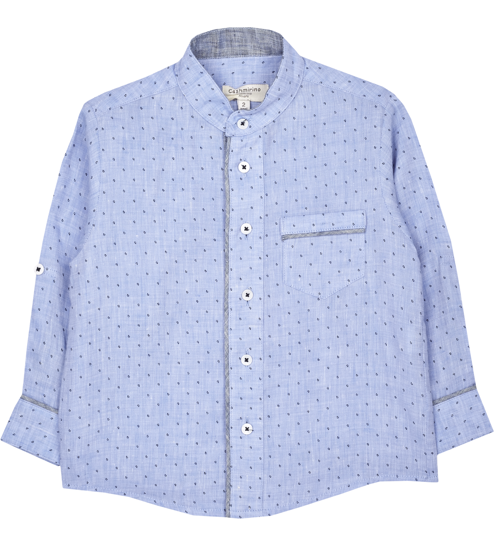 A stylish boy shirt featuring a Grandad collar, with internal contrast single piping and a single front pocket.