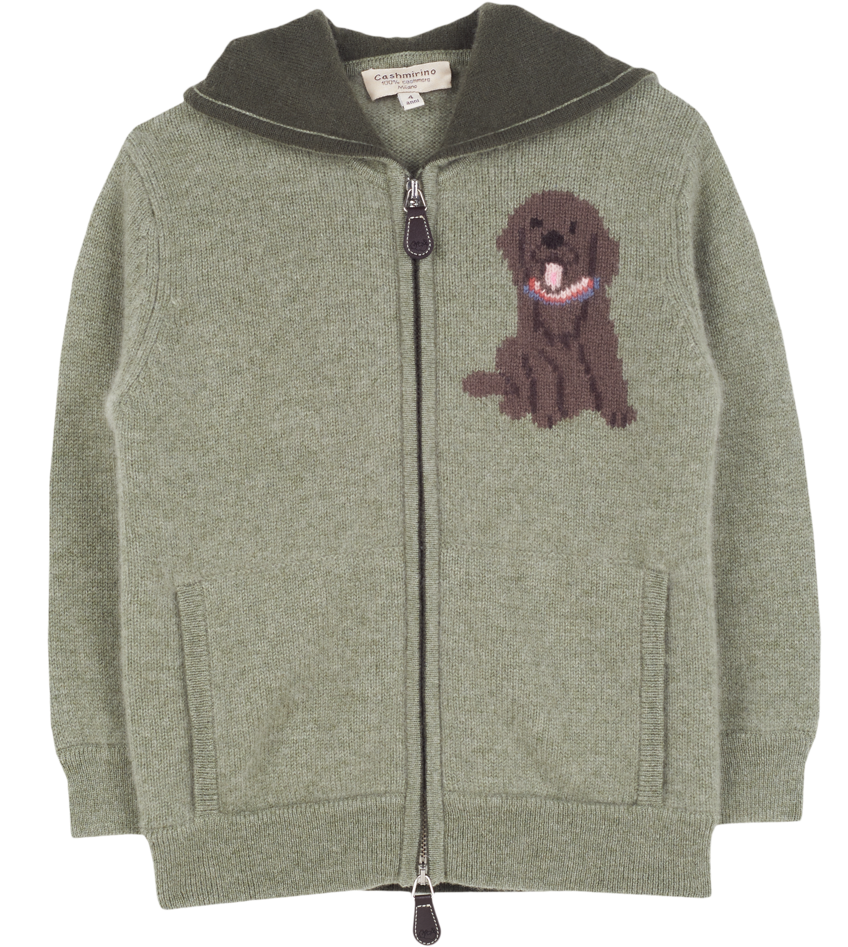 - Small intarsia on the chest representing a Labrador