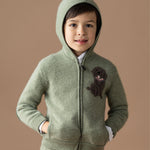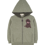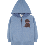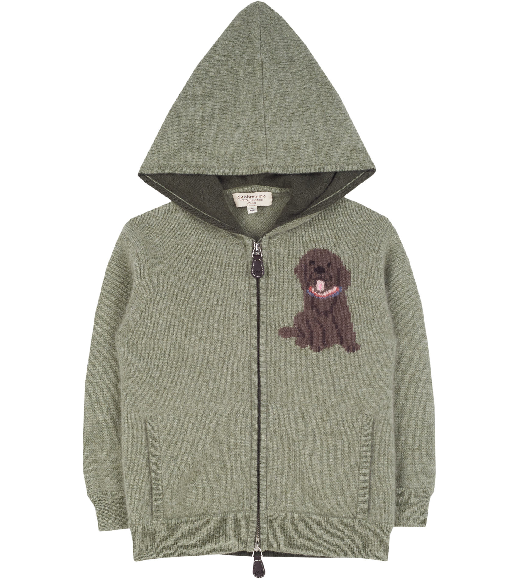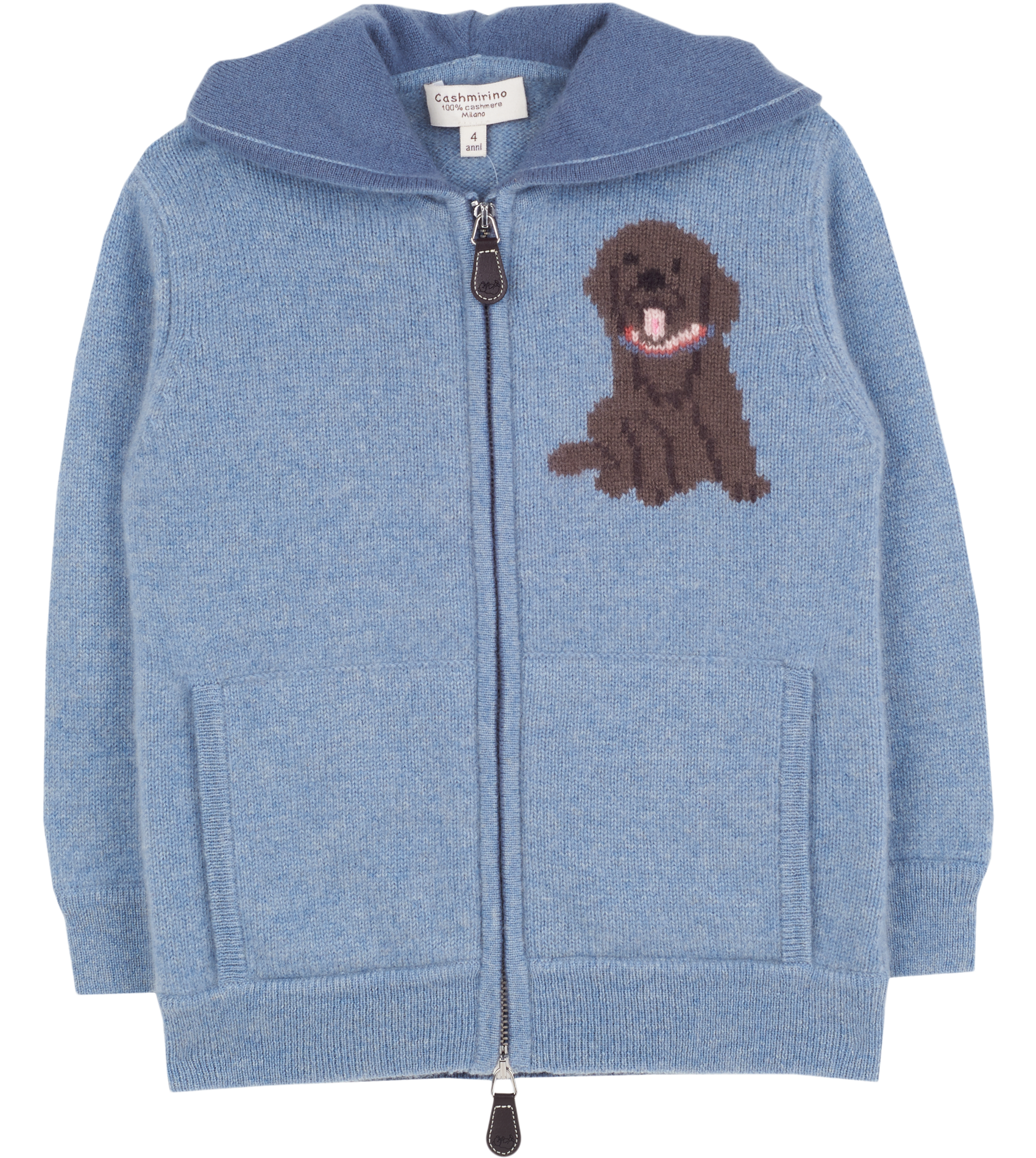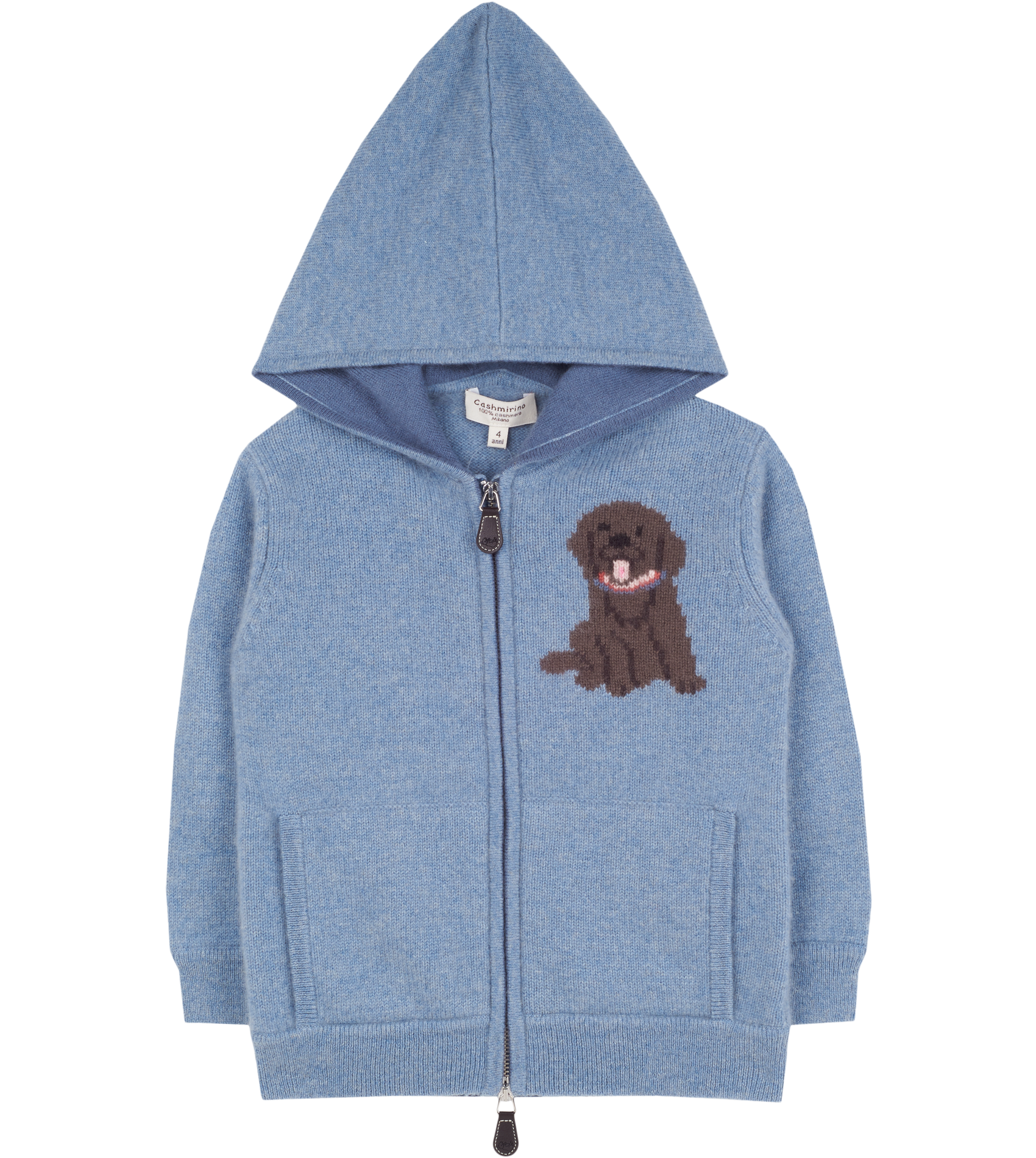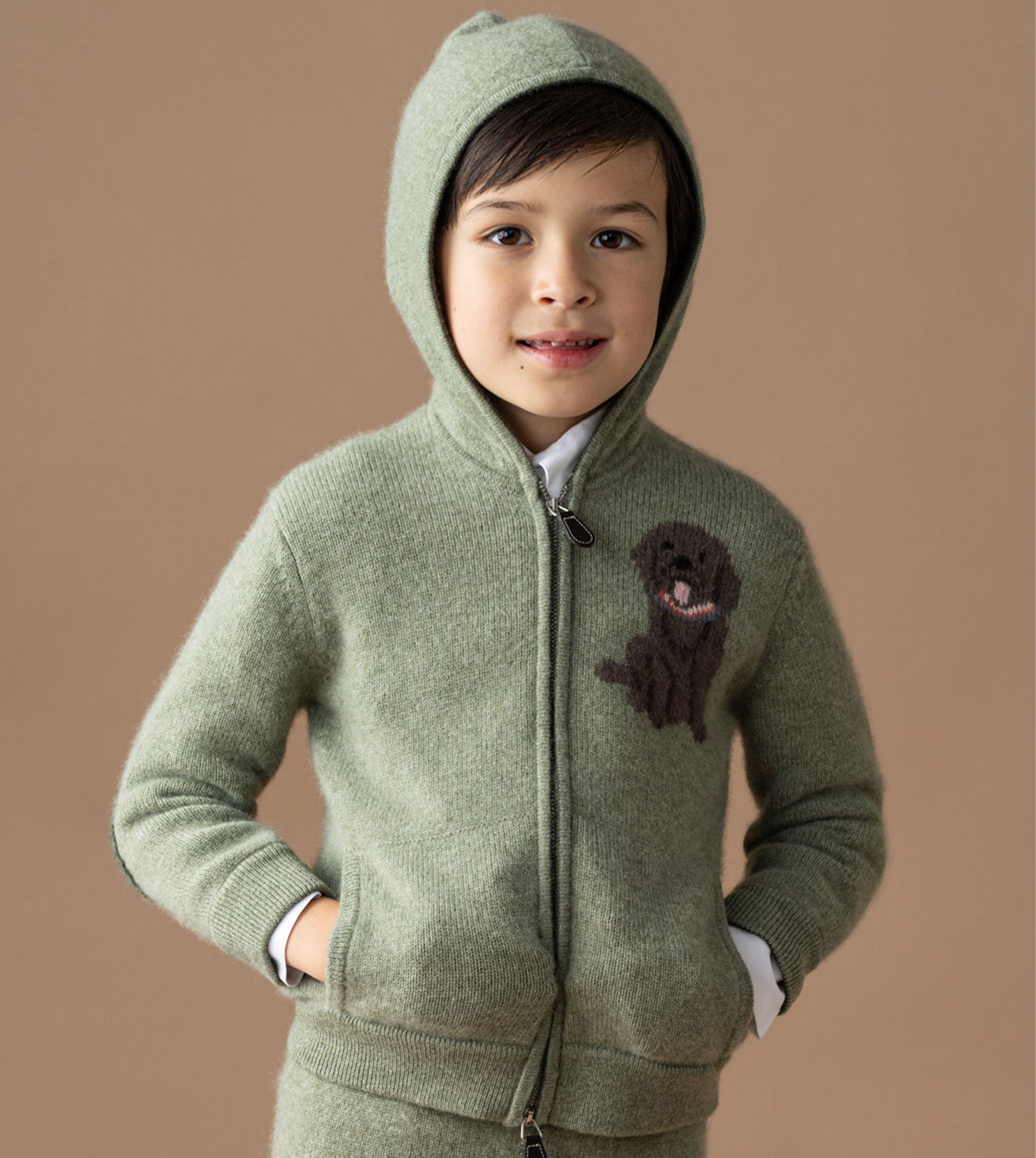 Let your little one be warm and cosy in our 100% Cashmere Pepis Hoodie. Featuring the star of the show, our Labrador, woven in a unique Intrasia stitch with contrasting elbow patches and colour on the inside of all borders, this is a beautiful added touch. With a hoodie, front pockets and zipper, this will keep your little one warm and makes it super easy for them to put on.