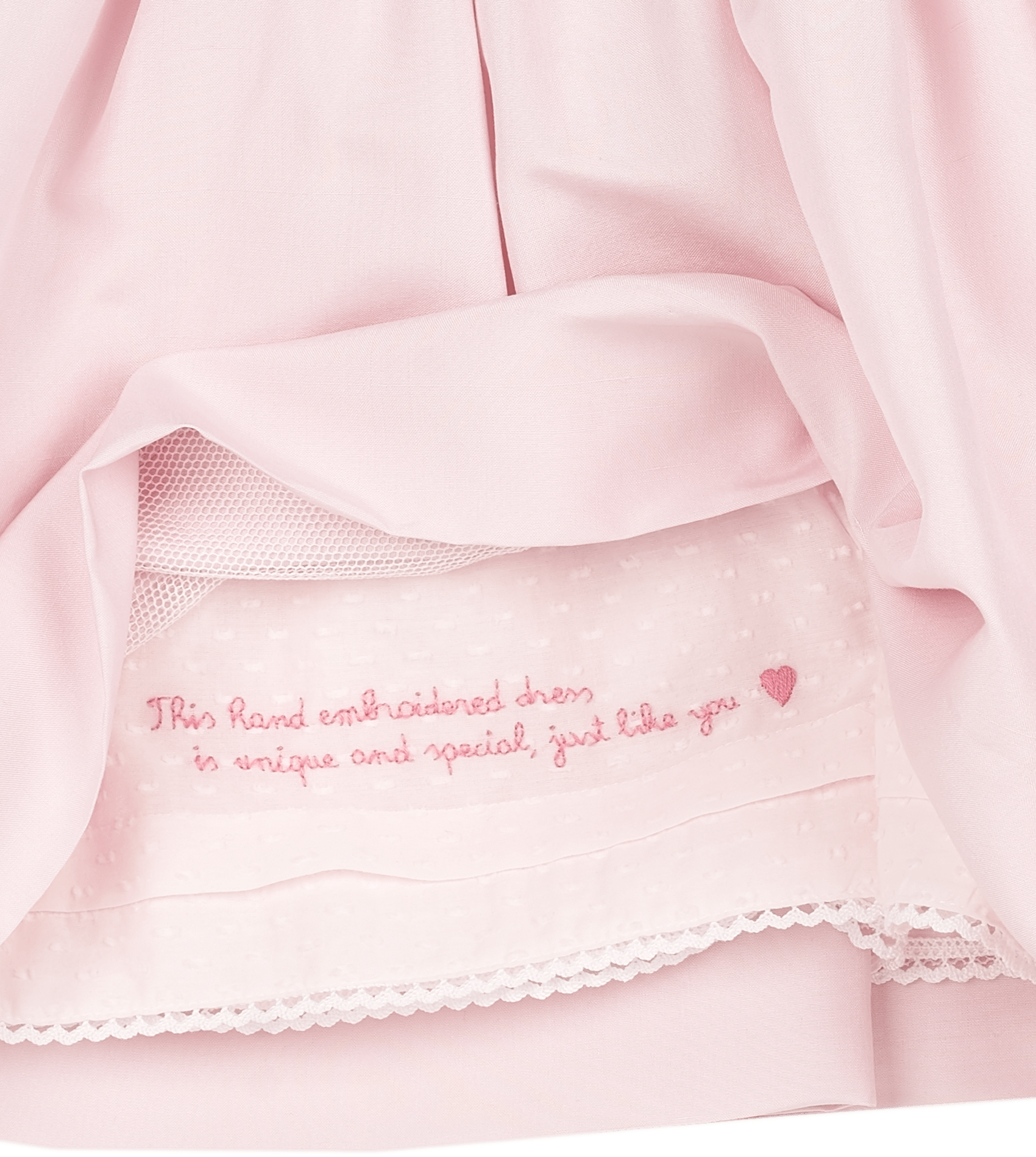 • Hand embroidered text on lining hem: "This hand embroidered dress is unique and special, just like you"