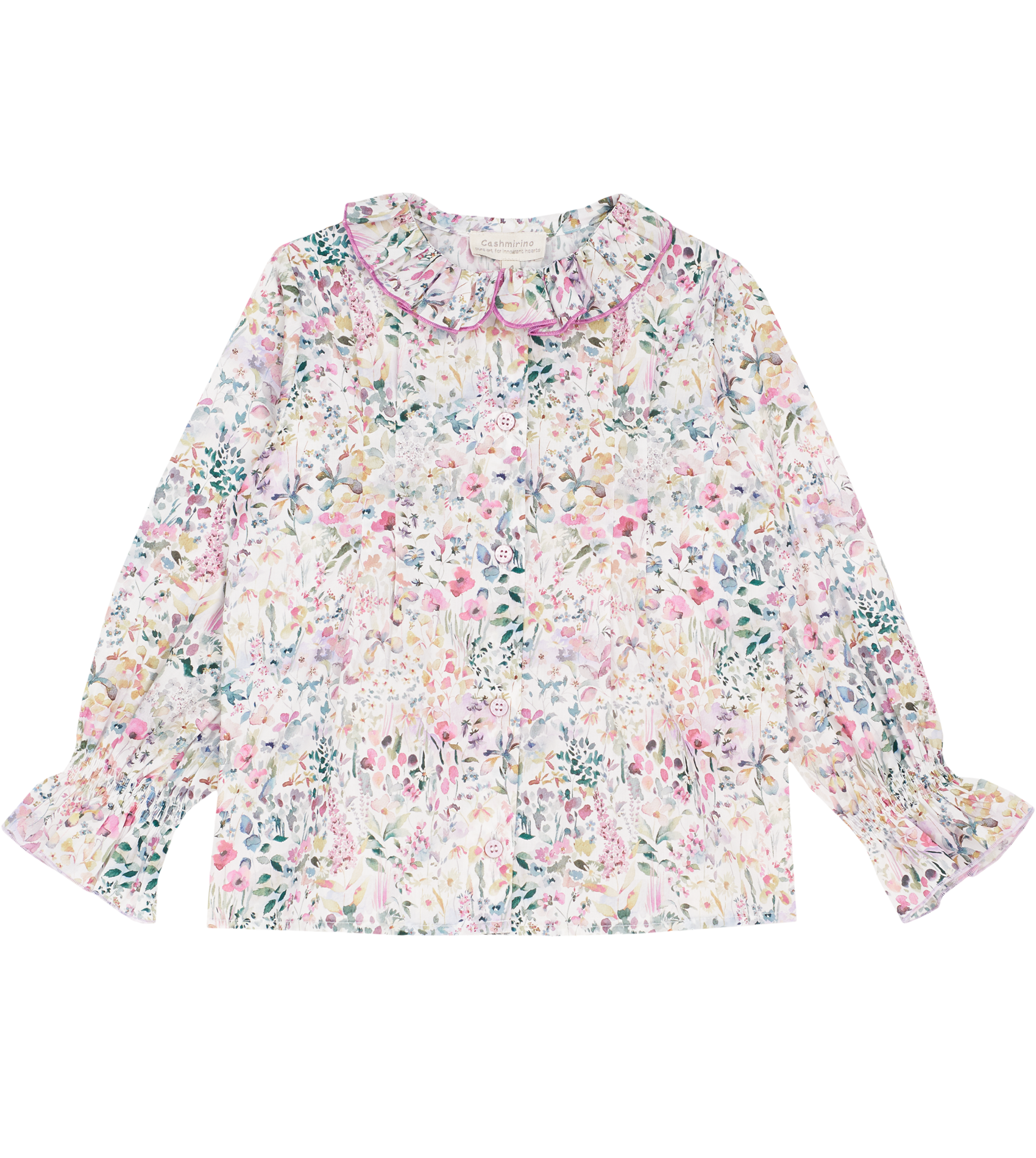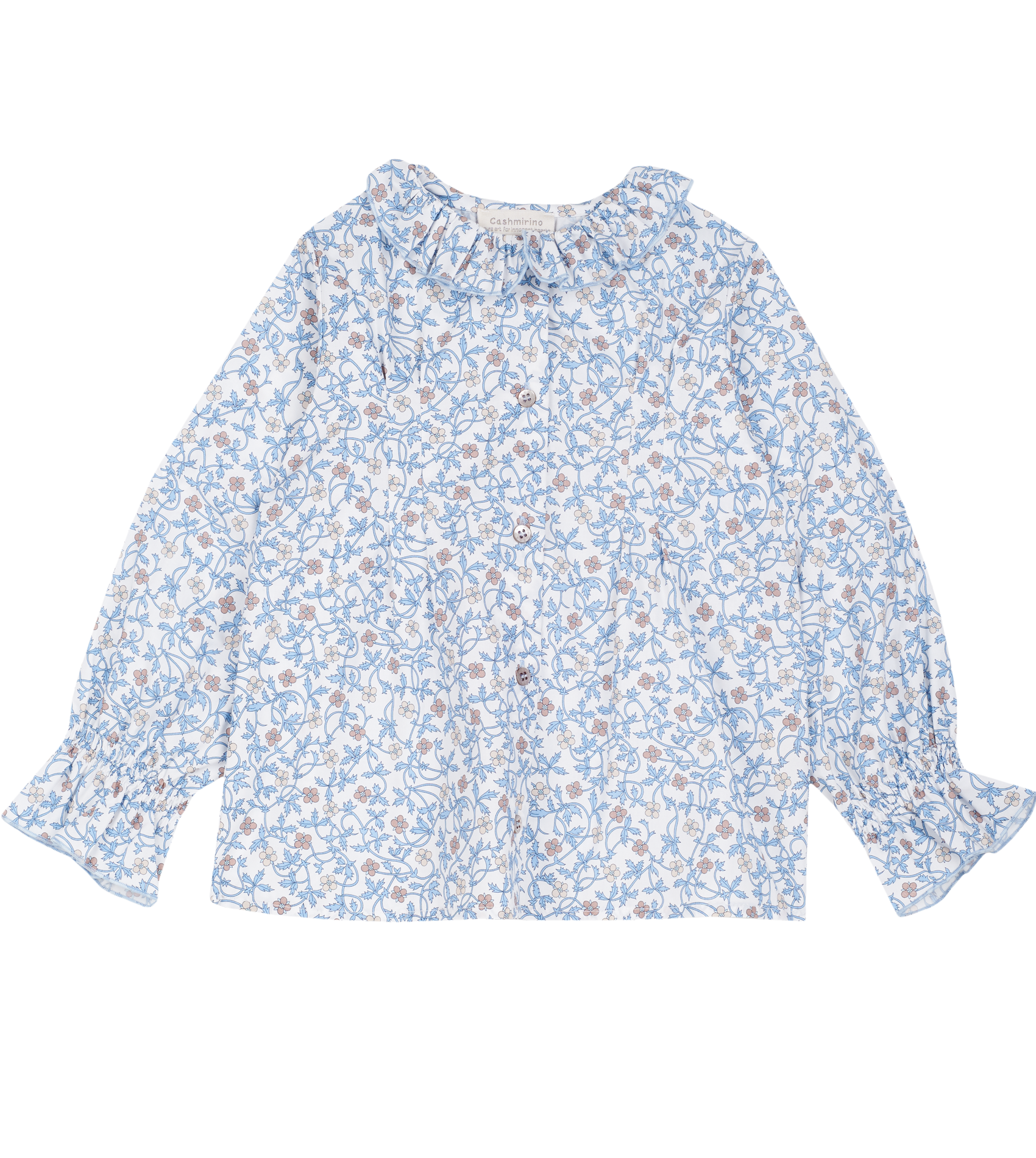 Capture the liberty of this stylish girl blouse made from 100% cotton with a ruffle collar, ruffle long sleeves and pleats on the top chest. Signature Cashmirino buttons on the front.