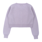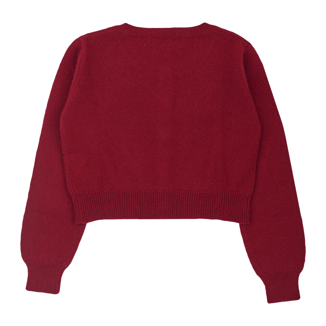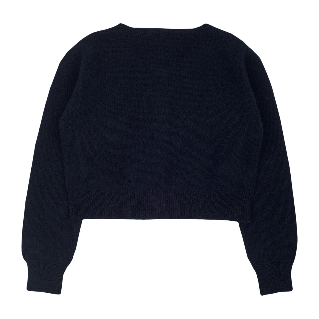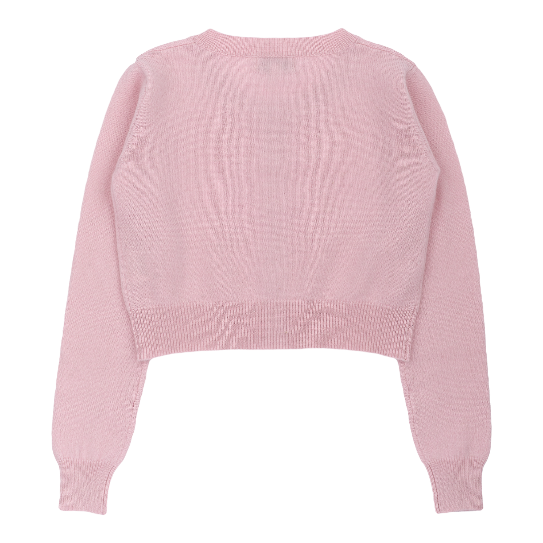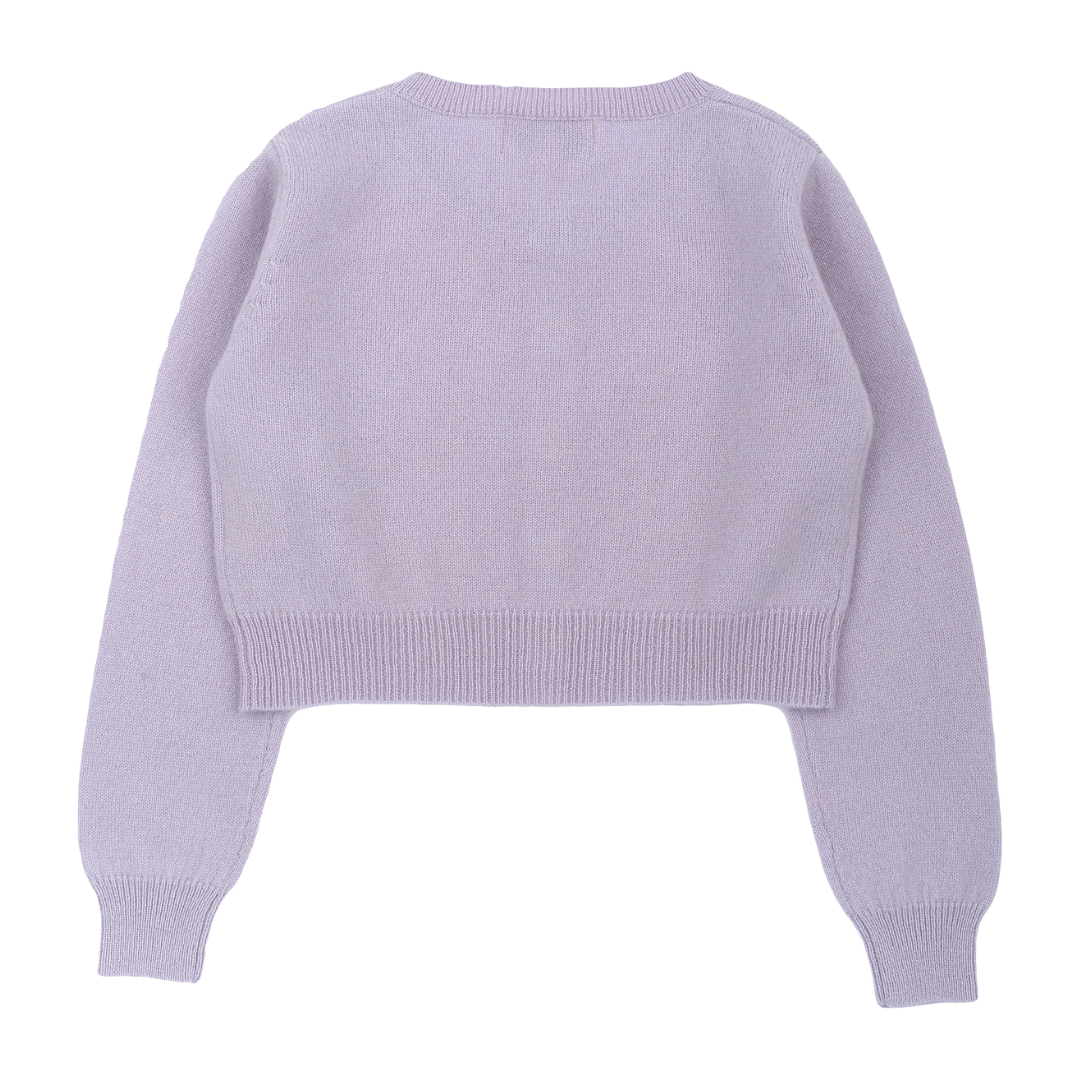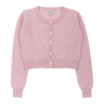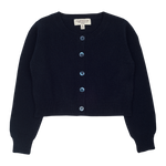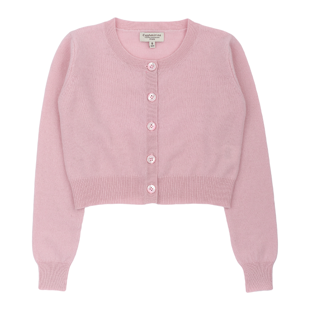 A modern girl shrug with a round neck, long sleeves and button fastening. Made from 100% lightweight cashmere for warmth and comfort.