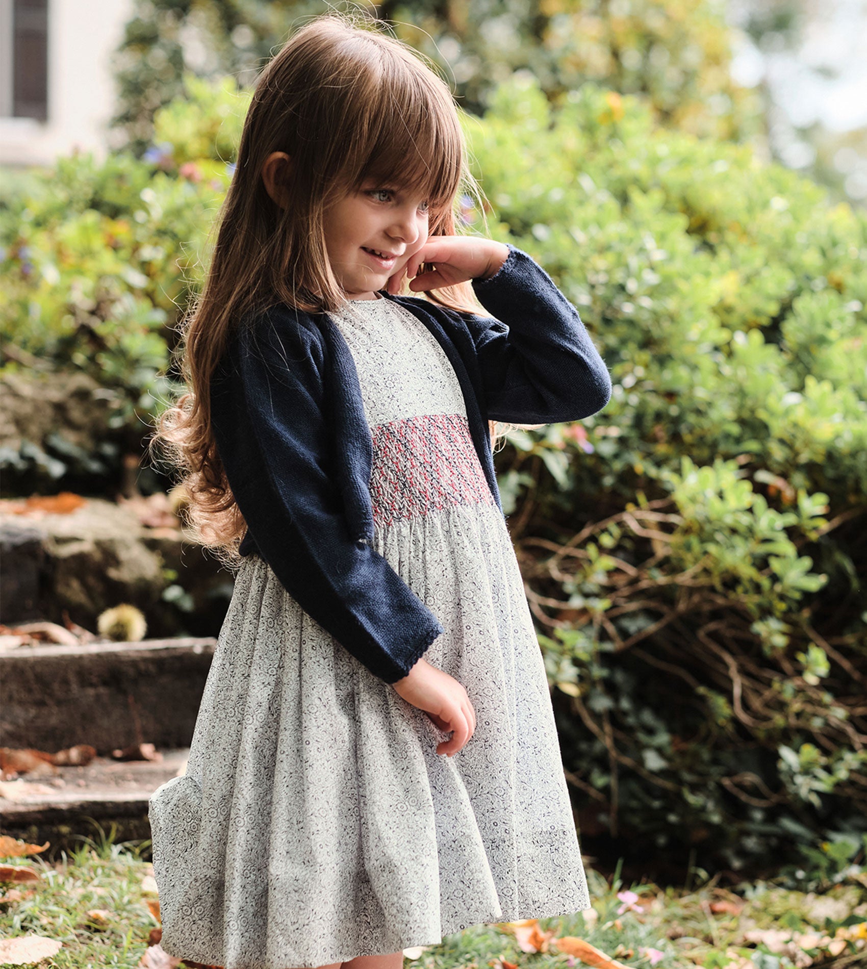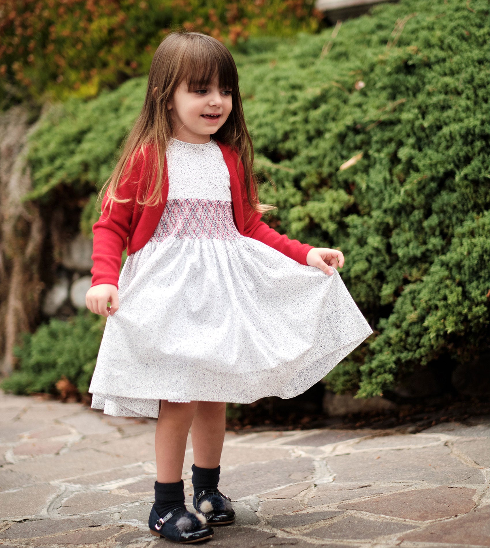 Our Cristina dress is one of our favourites with its intricate smocking all around the front and back panel with piping detail. It's a very romantic and stylish dress, perfect to celebrate and be twirled around in by mom or dad. They'll laugh, play and dance in this number.