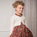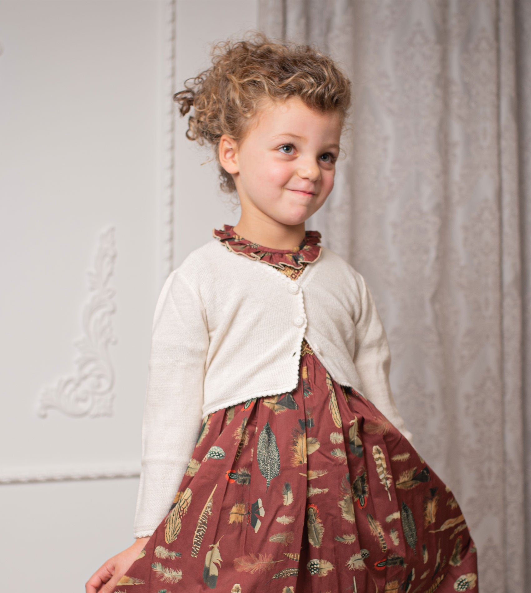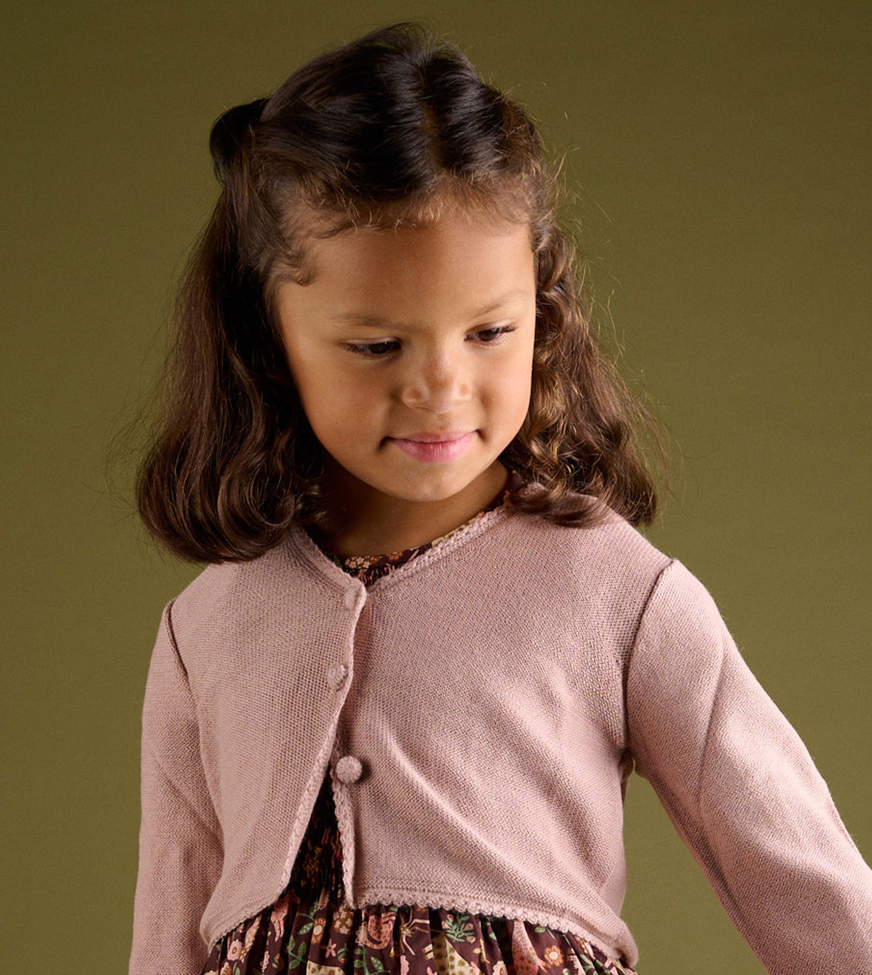 This exquisitely soft cardigan adds warmth without sacrificing style. Designed to be worn over our signature dresses, it features hand-crocheted buttons, delicate scalloped edges, and graceful lines for a refined silhouette.