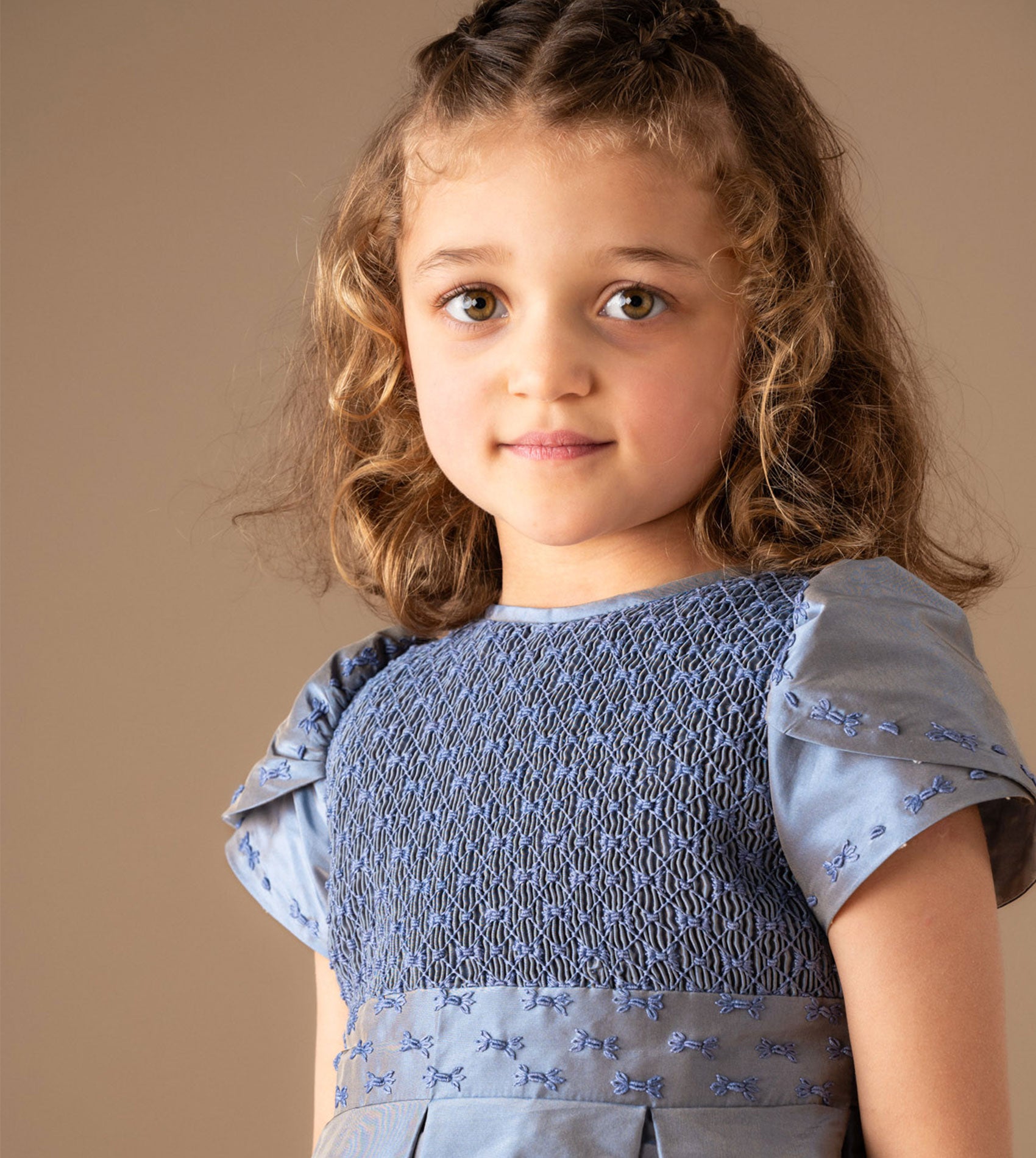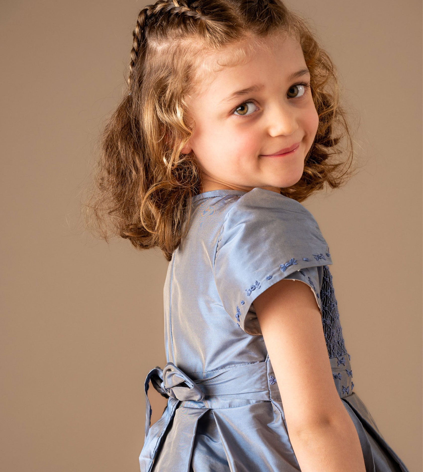 The Judith Dress is a beautifully crafted piece made from luxurious silk taffeta, offering a soft sheen and structured elegance. The bodice features intricate smocking and delicate hand embroidery, while a matching embroidered waist panel leads to a large back tie — both graceful and refined.