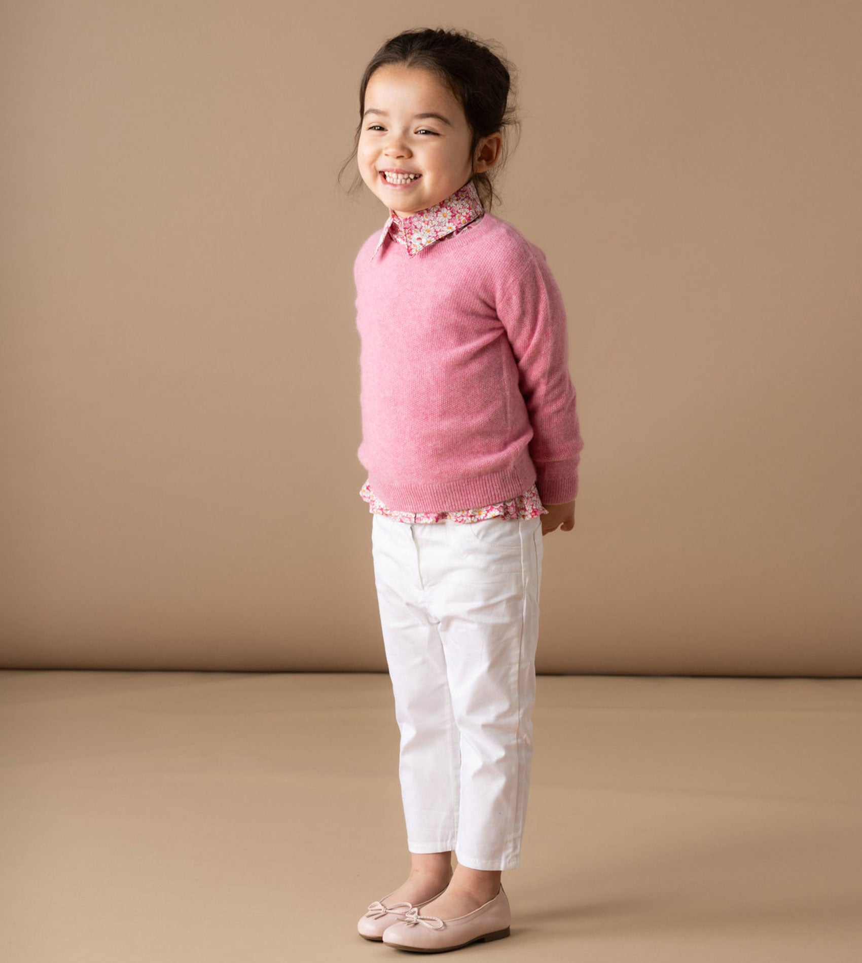 The Monica 100% Cashmere jumper is a bright addition to your little girl's wardrobe. Featuring a round neck with ribbed hem sleeves for a beautiful touch, a linen stitch for added depth and texture and a cute contrasting border on the borders of the jumper. Designed for all-day comfort, this jumper is great for colder days. From watching the changing of the leaves to observing the first snowflakes falling to the ground, it’s a charming sight.