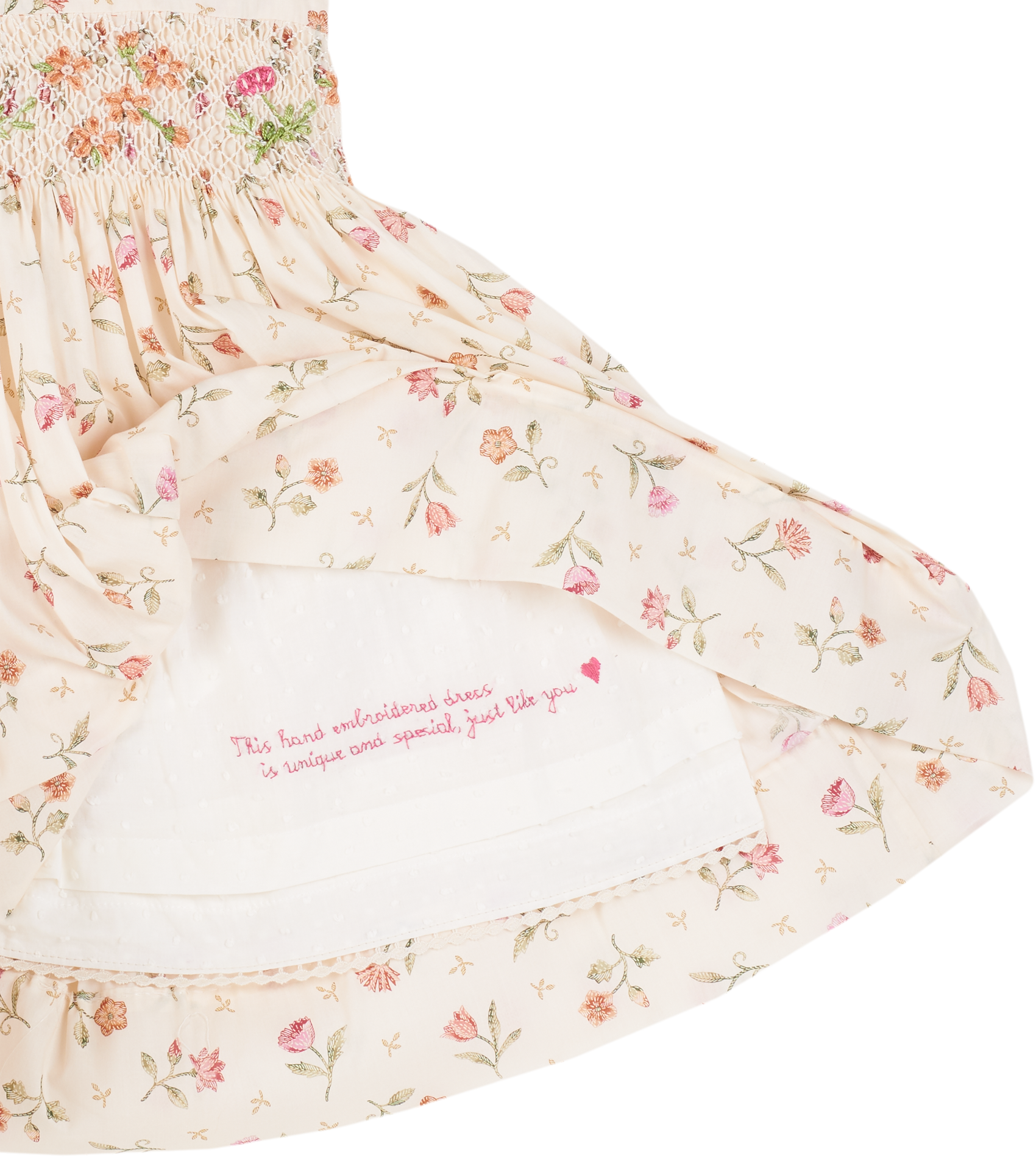 • Hand-embroidered text on lining hem: "This hand-embroidered dress is unique and special, just like you"
