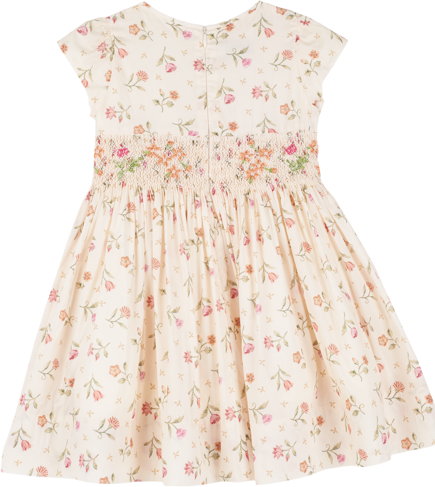 One of its standout features is the intricate smocked and embroidered waist panel, which beautifully adorns both the front and back, highlighting your waist and creating a lovely, flattering shape. Petal-embroidered cap sleeves add a touch of femininity, while the thoughtfully placed back zipper ensures easy wear without compromising style.