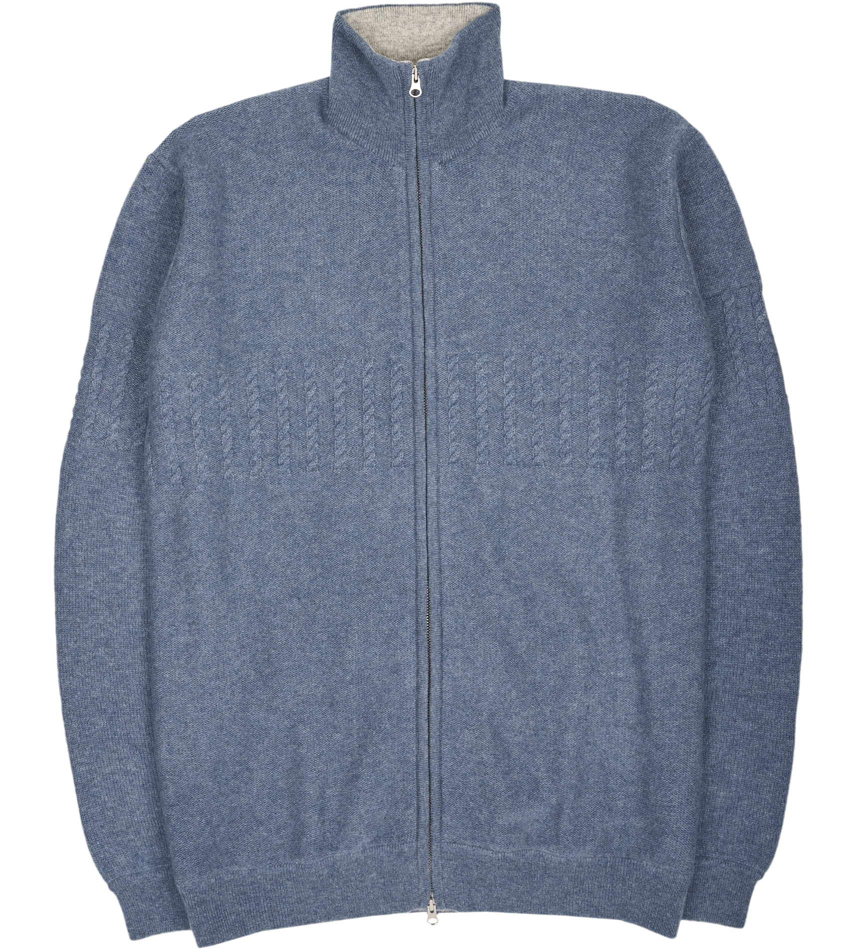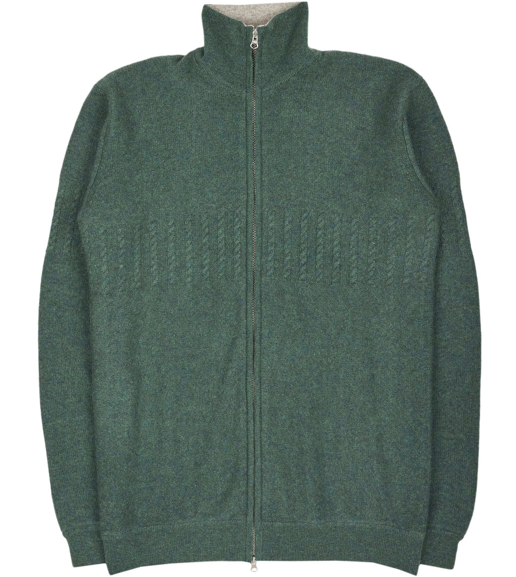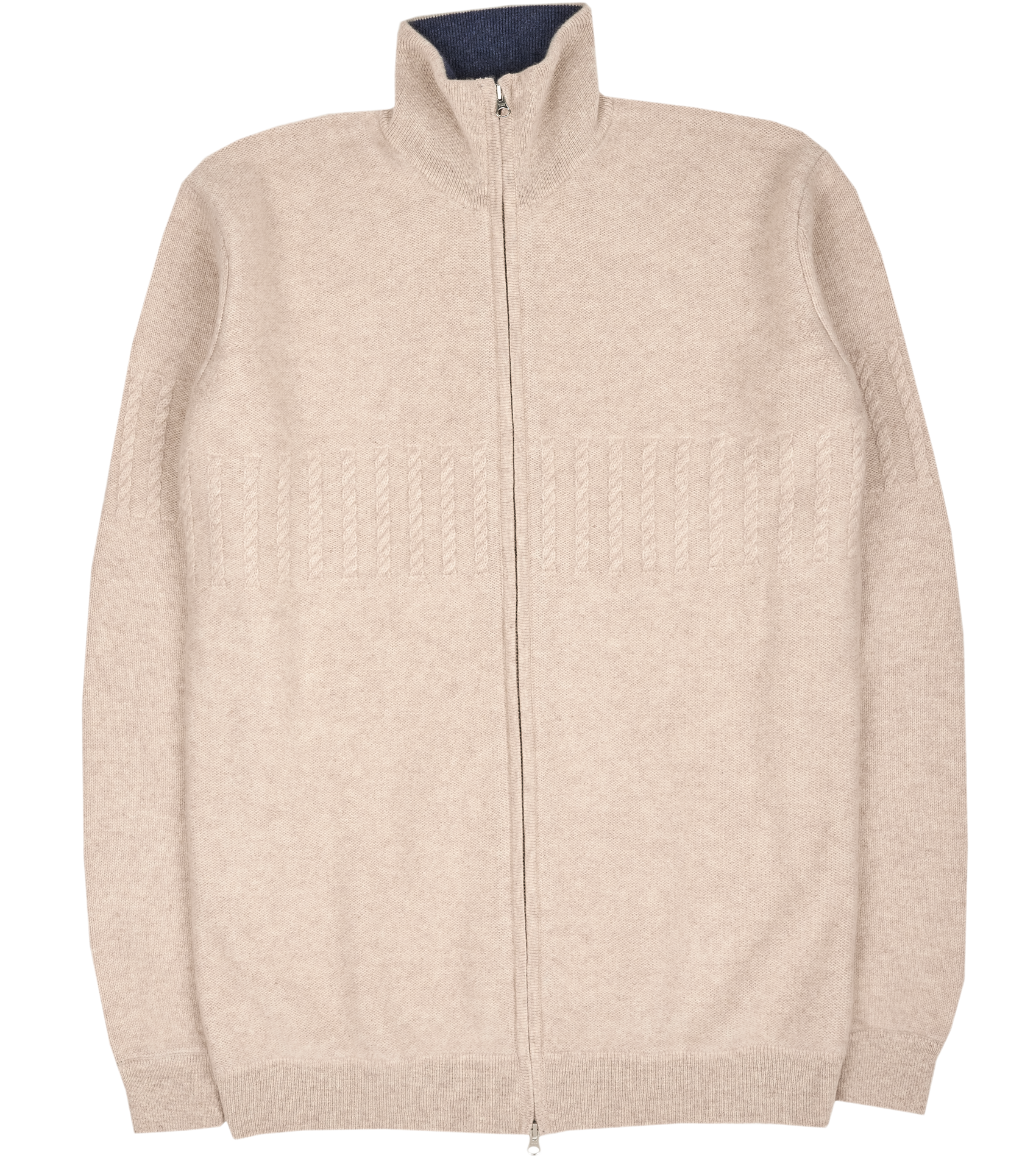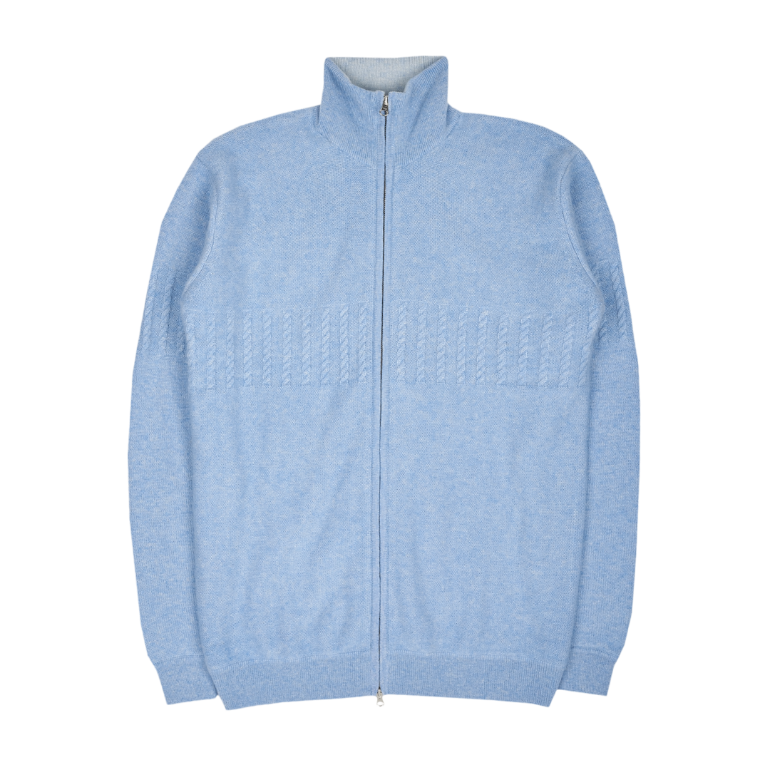 A classic high neck cardigan crafted from 100% pure cashmere, featuring elegant cable knit panels, long sleeves, a ribbed hem, and a practical zip fastening. Soft, breathable, and versatile, it’s perfect as a light jacket in warmer months or layered under coats on colder days, offering timeless style for any occasion.
