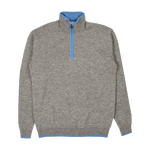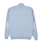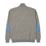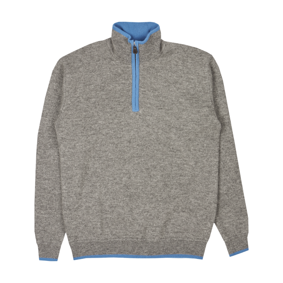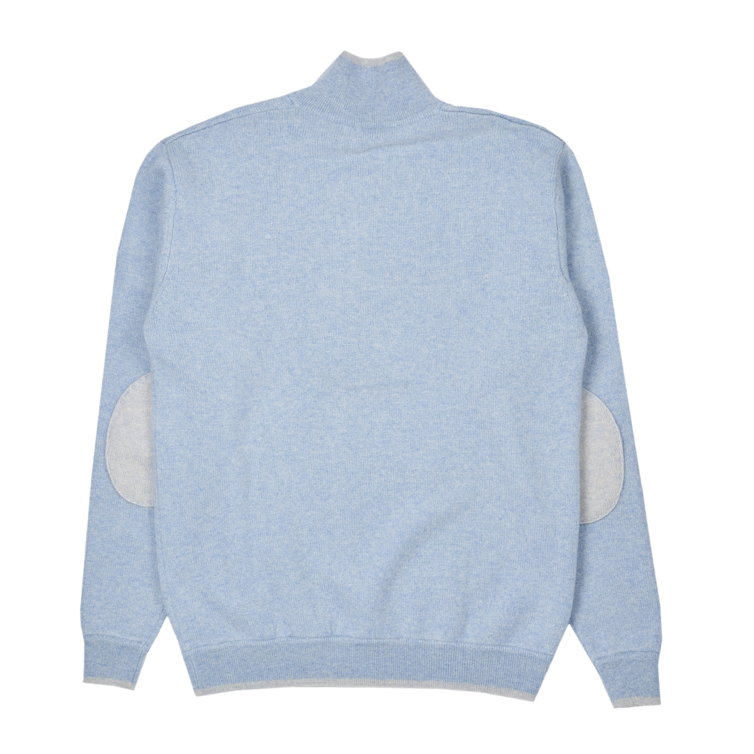 Our super-practical zip-neck jumper crafted from luxuriously soft Mongolian cashmere is always a favourite. Contrasting elbow patches and coloured tipping trim to the collar, zip, cuffs, and waist complete this perfect little package.