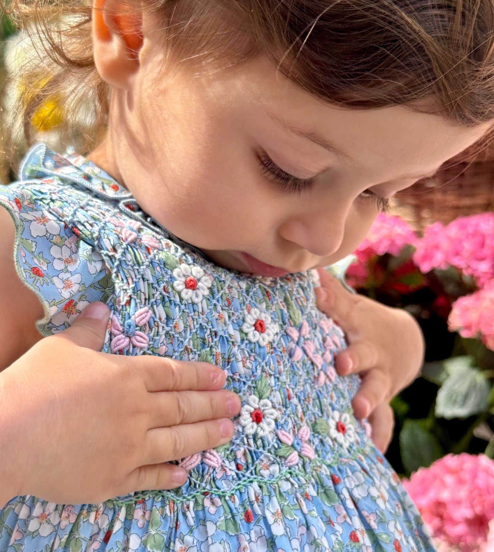 • Hand-smocked bodice with floral embroidery – delicate craftsmanship, made to treasure